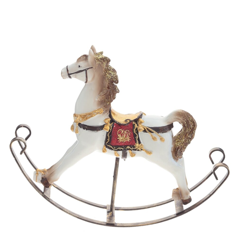 Фигурка изображает лошадку-качалку белого цвета. Ее можно использовать как для украшения комнаты, так и для дополнения новогодней сервировки стола. Станет прекрасным подарком к Новому году и Рождеству.