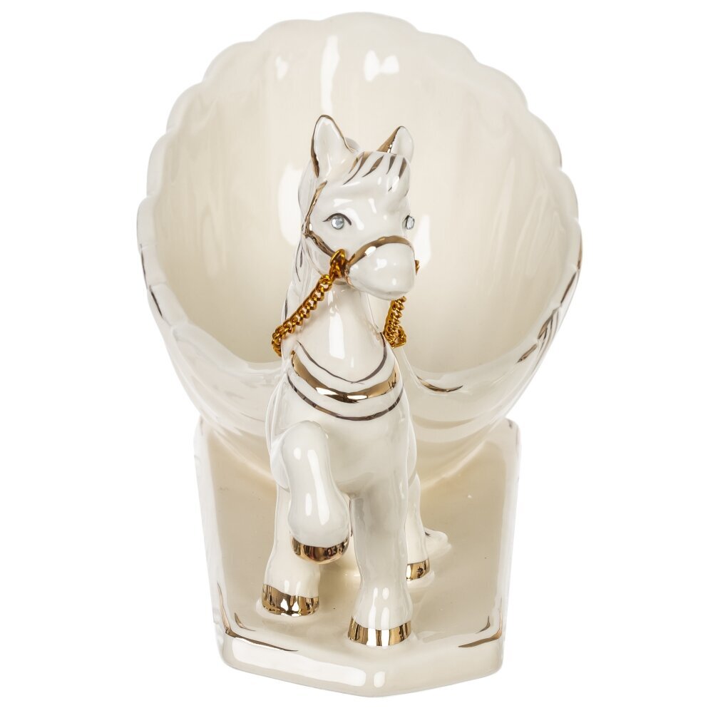 Элегантная декоративная фигурка в виде лошадки с подставкой для мелочей — это не только красивый элемент интерьера, но и практичный аксессуар. Изготовлена из высококачественного белого фарфора и украшена утонченными золотыми элементами, она придаёт пространству изысканность и уют. Подставка может использоваться для хранения украшений или других мелких предметов. Такая фигурка станет прекрасным подарком, символизирующим удачу, движение вперёд и гармонию. Идеально впишется в классический и современный интерьер, украсит полку, туалетный столик или рабочее место. Благородное сочетание белого и золотого цветов делает изделие универсальным и по-настоящему праздничным.