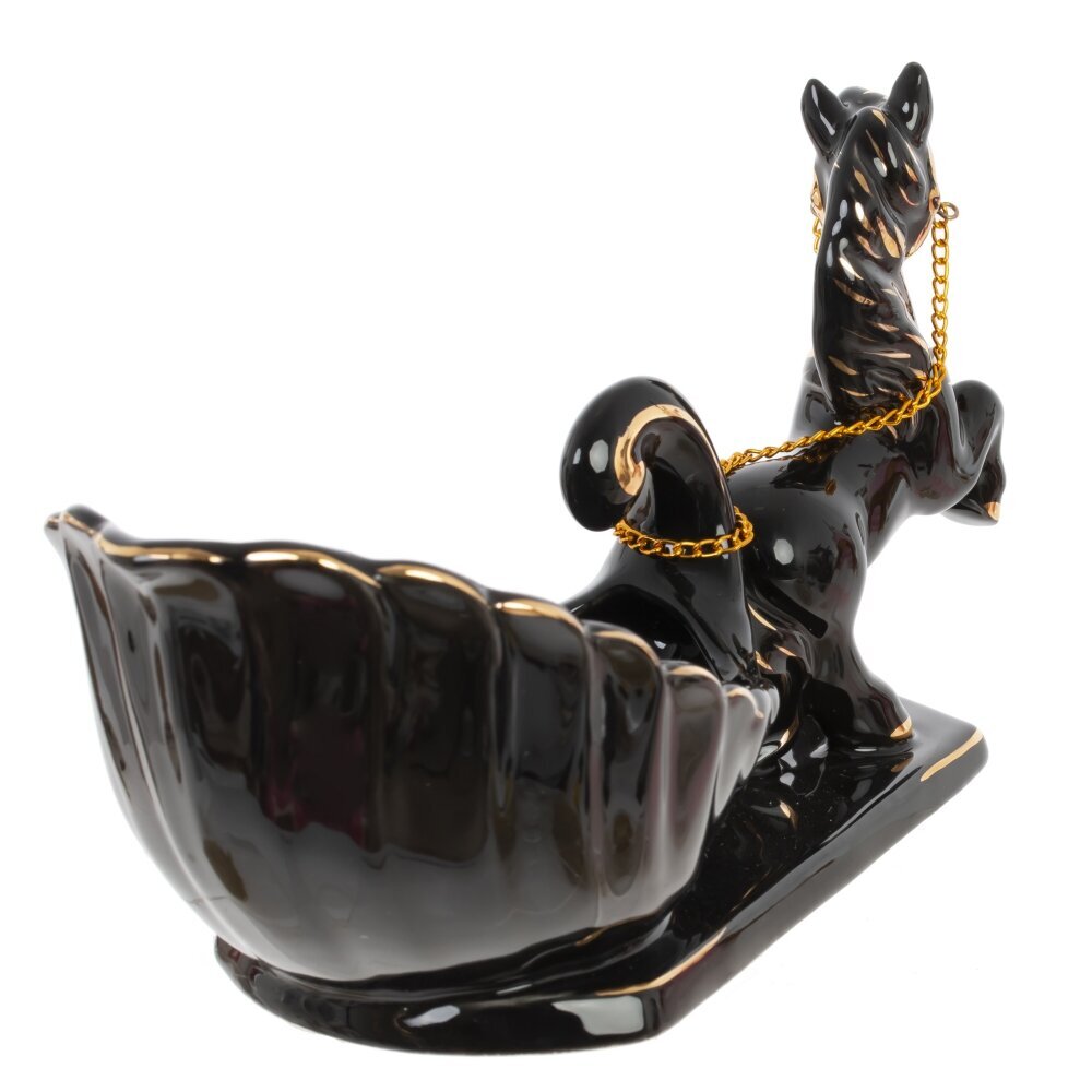 Элегантная декоративная фигурка в виде лошадки с подставкой для мелочей — это не только красивый элемент интерьера, но и практичный аксессуар. Изготовлена из высококачественного фарфора черного цвета и украшена утонченными золотыми элементами, она придаёт пространству изысканность и уют. Подставка может использоваться для хранения украшений или других мелких предметов. Такая фигурка станет прекрасным подарком, символизирующим удачу, движение вперёд и гармонию. Идеально впишется в классический и современный интерьер, украсит полку, туалетный столик или рабочее место. Благородное сочетание цветов делает изделие универсальным и по-настоящему праздничным.