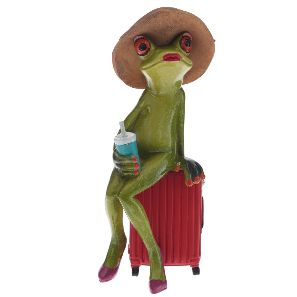 Фигурка Лягушки в ярких туфлях и в шляпе сразу привлекает внимание своим необычным стилем. Лягушка сидит на большом красном чемодане, который намекает на постоянные путешествия. Фигурка может стать прекрасным подарком для тех, кто модный и стильный, с активным образом жизни.
