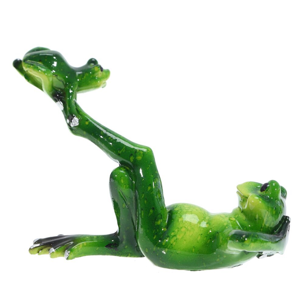 Декоративная фигурка из полимерных материалов, выполненная в форме двух забавных лягушек. Основная лягушка лежит на спине в расслабленной позе, опираясь на локоть и подняв одну ногу вверх. На стопе этой вытянутой ноги расположилась еще одна маленькая лягушка, что придает композиции игривость и динамику. Поверхность фигурки имеет глянцевое покрытие, а насыщенные оттенки зеленого цвета с характерным пятнистым рисунком делают ее очень яркой и выразительной. Такая фигурка может стать отличным украшением для интерьера, добавив нотку юмора и уюта любой комнате, а также подойти для коллекций, связанных с животными или природой. Изделие отличается аккуратной детализацией, благодаря чему привлекает внимание и вызывает улыбку.