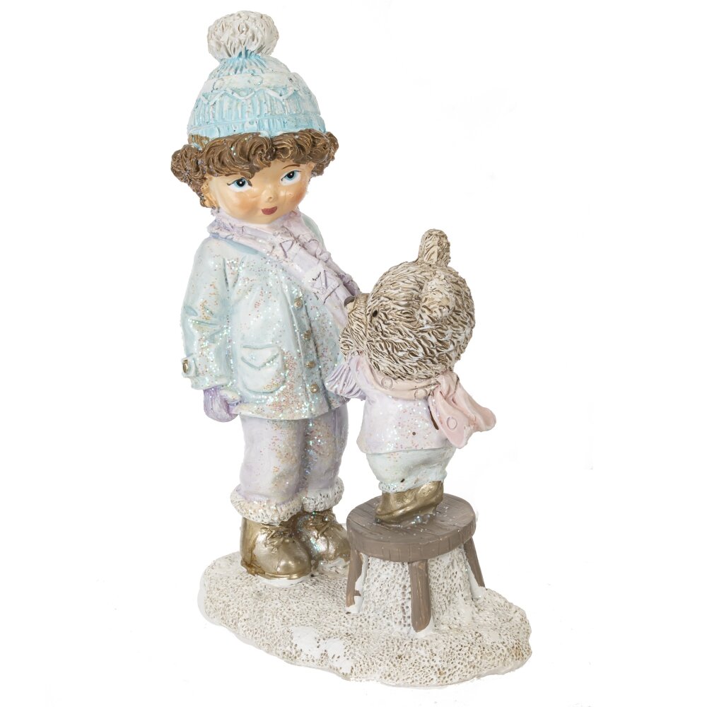 Декоративная фигурка "Мальчик и медвежонок" представляет собой милую сцену, где заботливый медвежонок повязывает шарф на шею мальчику. Внимание к деталям поражает: пастельные цвета, аккуратно прорисованные черты лиц и нежные текстуры создают теплое новогоднее настроение. Игра глиттера придает фигурке особый блеск, символизируя праздник. Эта очаровательная композиция станет прекрасным украшением вашего интерьера и вызовет улыбку у всех, кто её увидит.