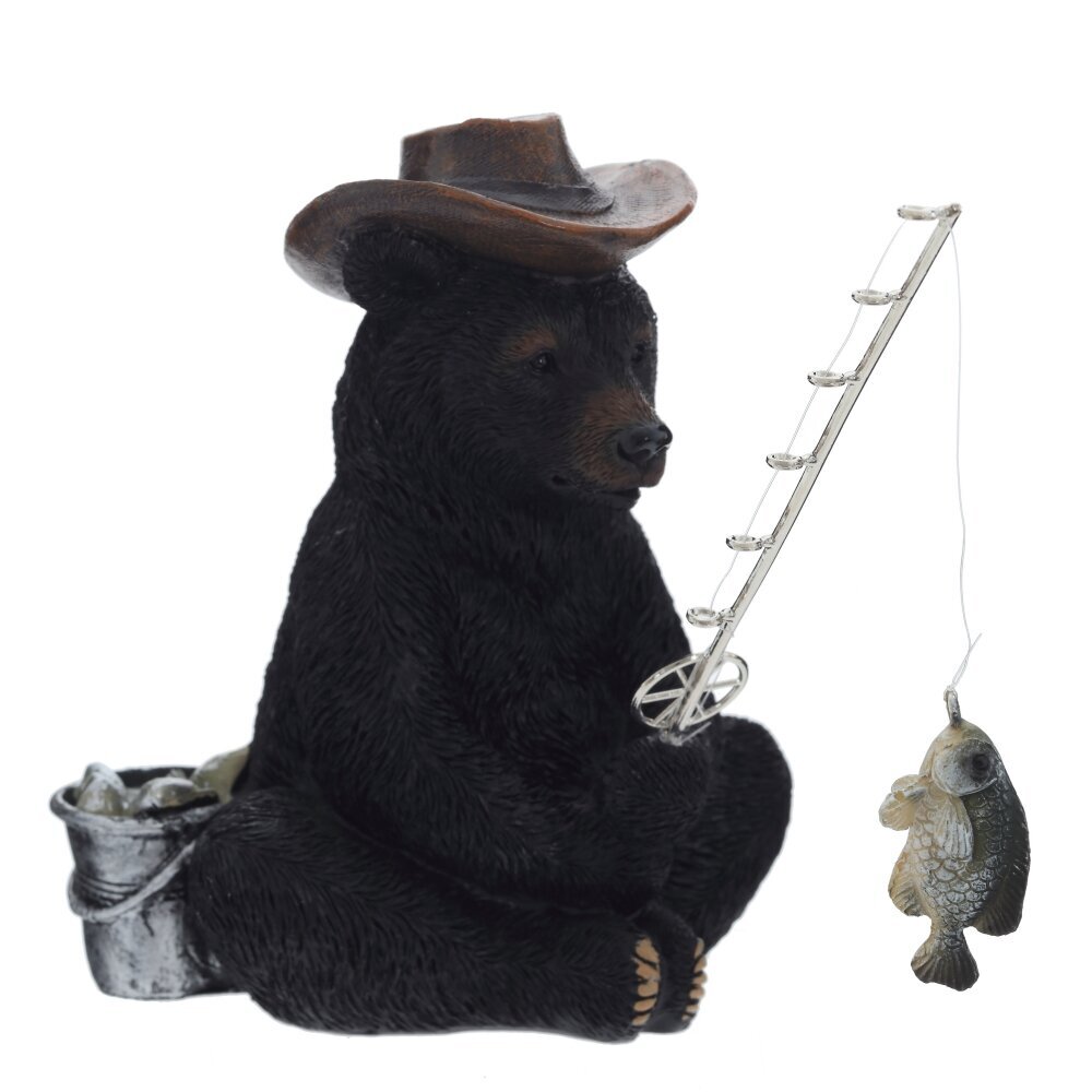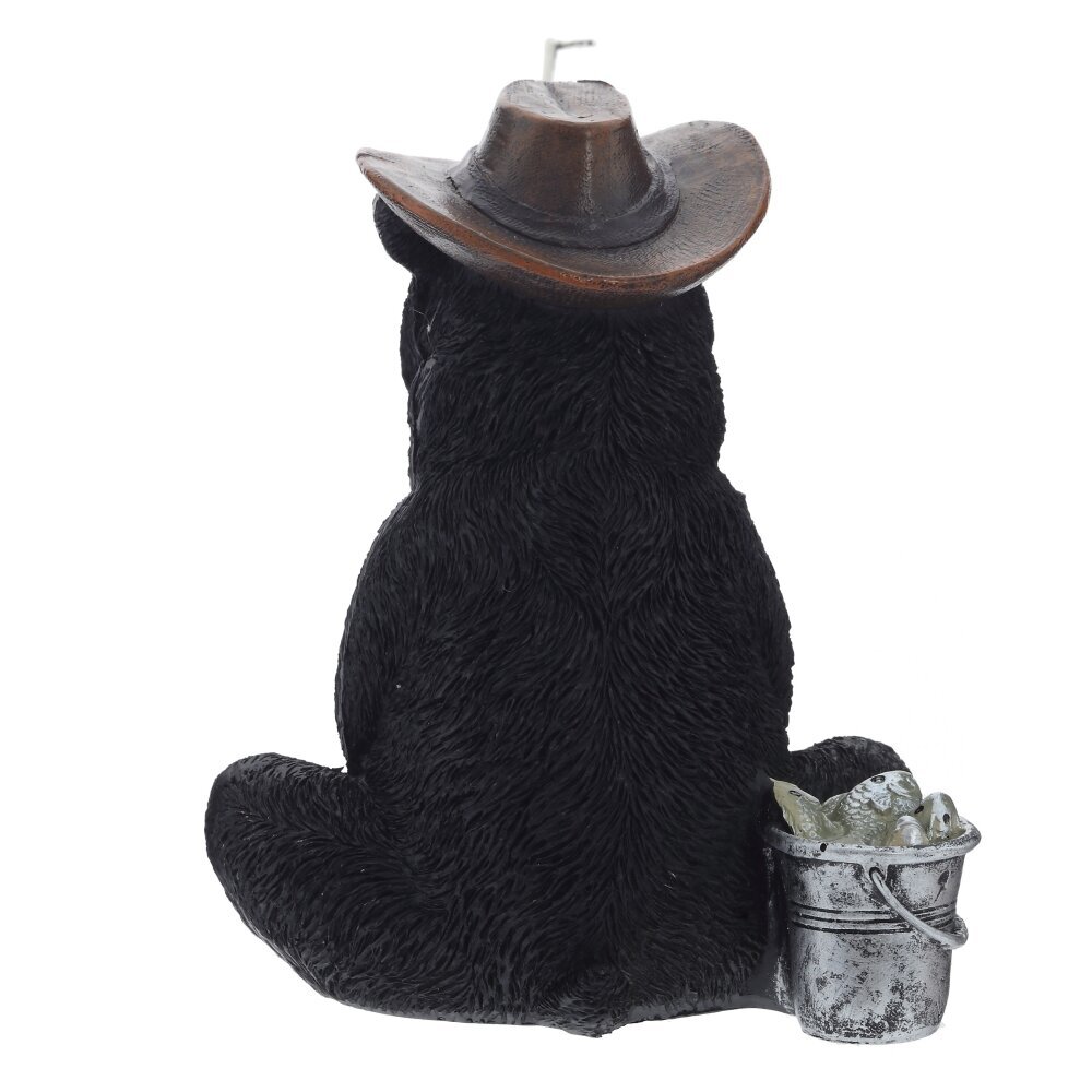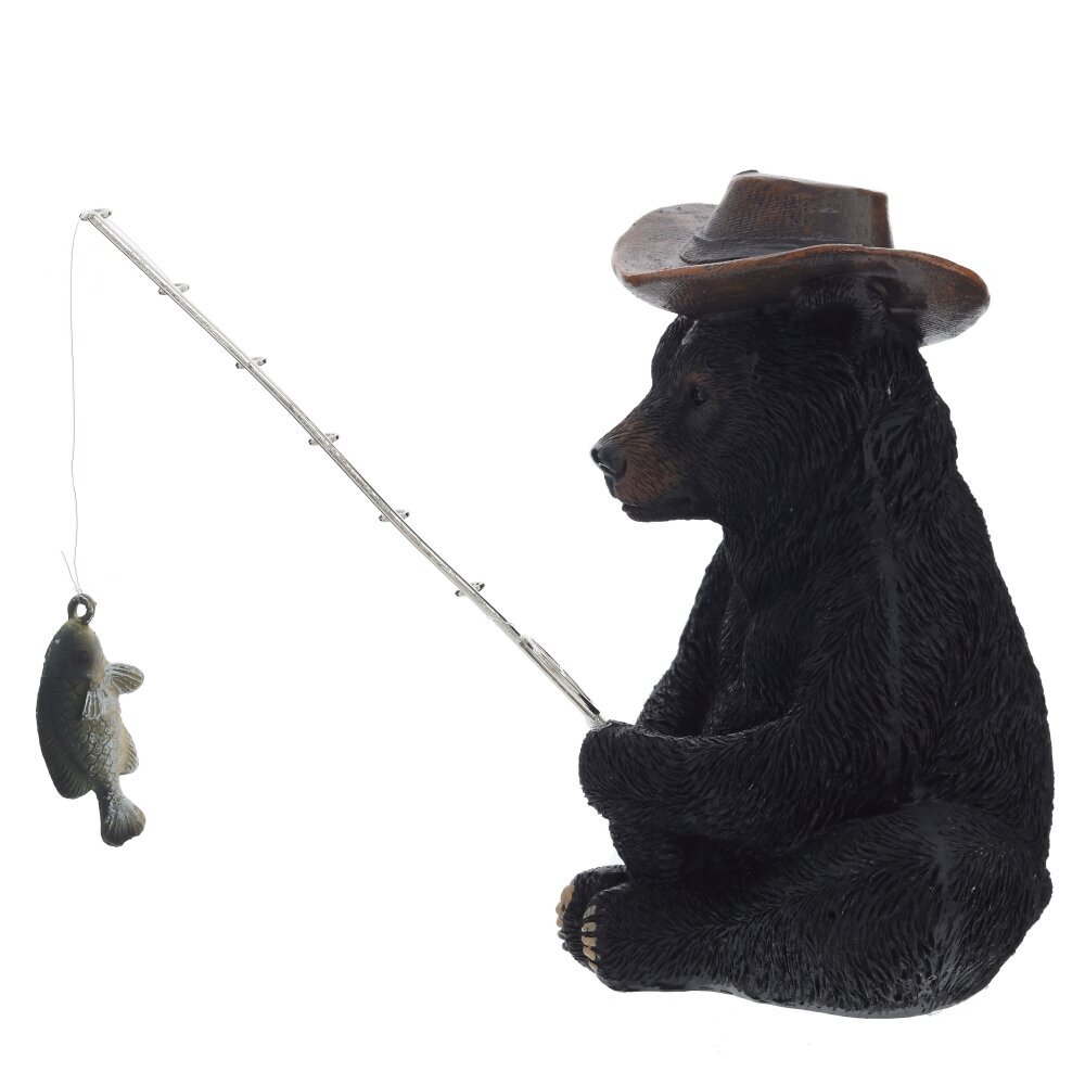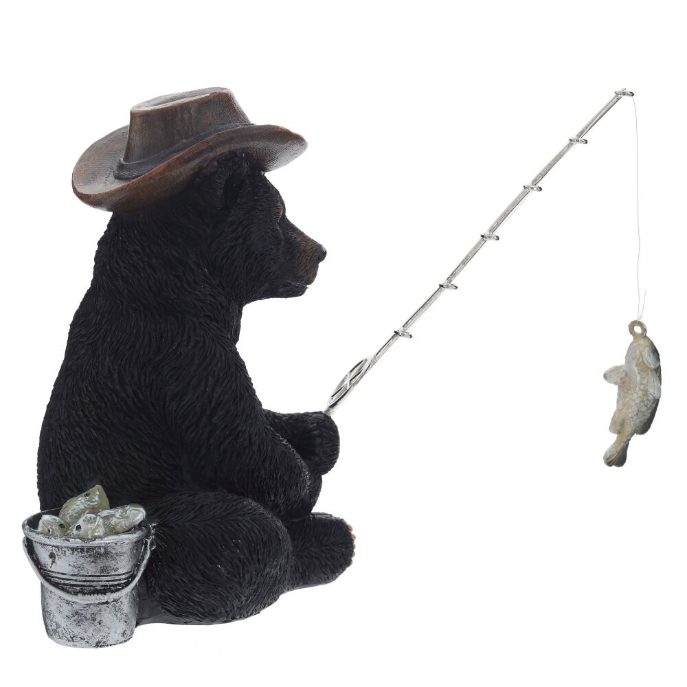 Декоративная фигурка из полимерных материалов изображает забавного медведя, который сидит с удочкой в лапах и ловит рыбу. Медведь выполнен с высокой детализацией: его густая черная шерсть, выразительная морда и округлые лапы тщательно прорисованы, что придает фигурке особую привлекательность. На голове у медведя надета ковбойская шляпа, что добавляет образу озорства и характерный шарм. В лапах он держит удочку, а на крючке болтается улов — рыба, выполненная в реалистичных оттенках. Рядом с медведем расположен металлический ведерко, наполненное уловом. Такая фигурка может украшать интерьер дома, быть оригинальным подарком для любителей рыбалки или коллекционеров забавных фигурок животных. Она отлично подойдет для декорации детской комнаты, гостиной или дачи, привнеся в атмосферу немного уюта, юмора и деревенского колорита. Полимерные материалы, из которых изготовлена фигурка, обеспечивают ее прочность и долговечность.