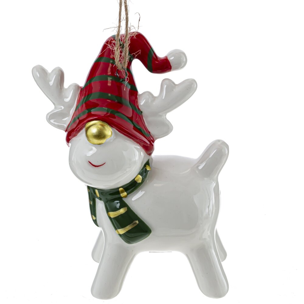 Встречайте очаровательного оленя, который станет прекрасным украшением вашего новогоднего интерьера и создаст праздничную атмосферу! Эта подвесная фигурка, выполненная из керамики с глянцевым покрытием, порадует вас своей красотой и изысканностью. Олень выполнен в классическом новогоднем стиле и украшен оригинальными деталями, которые делают его особенно милым и забавным.Золотой нос оленя придает ему особый шарм, а яркий новогодний колпак и шарфик создают праздничное настроение. Украшение будет отлично смотреться в любом интерьере, создавая атмосферу зимней сказки и праздничного волшебства. Подарите себе или своим близким этого очаровательного оленя, и он принесет в ваш дом радость и волшебство новогодних праздников!