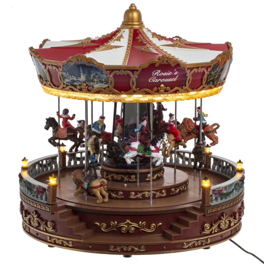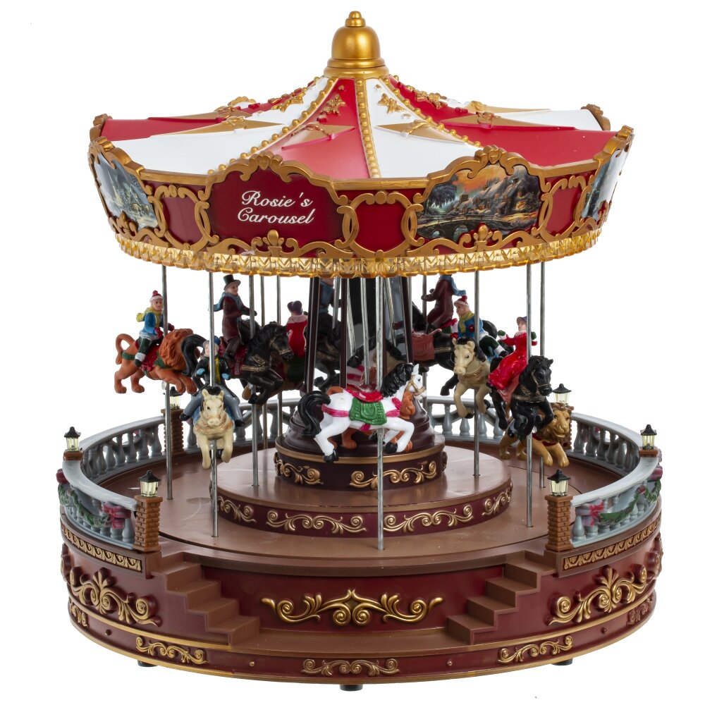 Карусель выполнена в ярких тонах, приковывающих к себе внимание. Резной купол украшен интересным орнаментом, на лошадках сидят веселые дети. Фигурка музыкальная, с подсветкой и функцией движения, изготовлена из полимерных материалов. Работает от трех батареек АА (не прилагаются). Шнур питания Кабель USB 151 см входит в комплект.