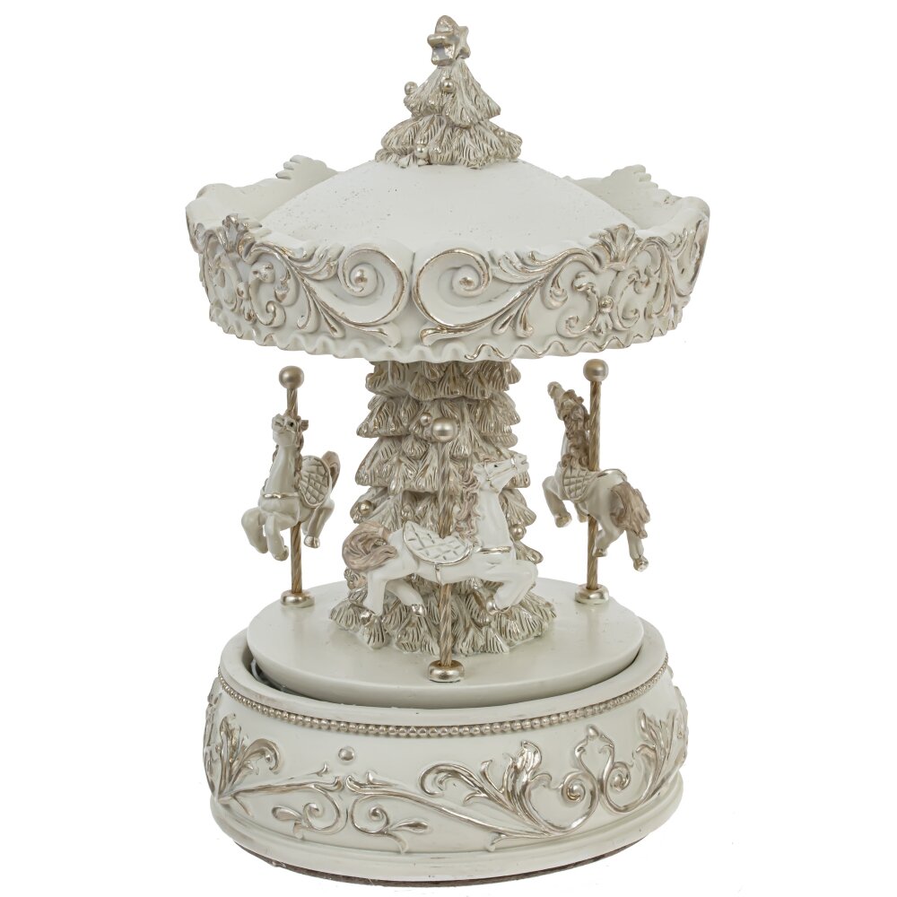 Фигурка оснащена механическим заводом, который активируется простым поворотом от руки. Как только вы заведёте карусель, начинает звучать знаменитая мелодия "We Wish You a Merry Christmas", наполняя пространство праздничными нотами.