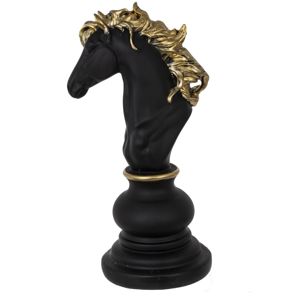 На изображении представлена элегантная декоративная фигурка в виде шахматного коня, выполненная из современных полимерных материалов. Особое внимание привлекает контрастное сочетание матового чёрного корпуса и изысканных золотых акцентов на гриве и основании фигуры. Такая скульптура станет стильным украшением интерьера, подчеркнёт утончённый вкус владельца и добавит нотку интеллектуальной игры. Благодаря детализированной проработке форм, фигурка поражает своей реалистичностью и благородством. Она отлично подойдет как элемент дизайна для кабинета, гостиной.