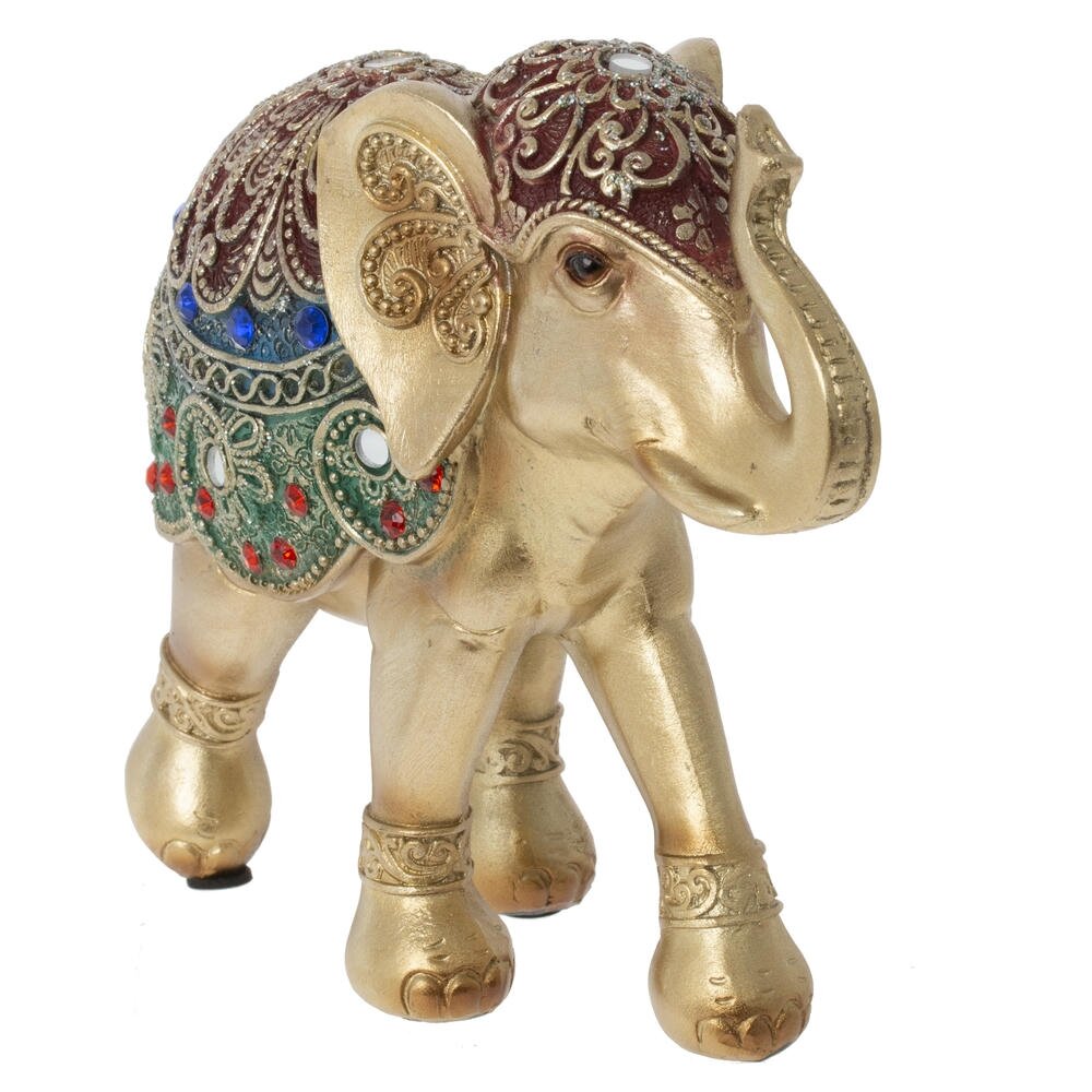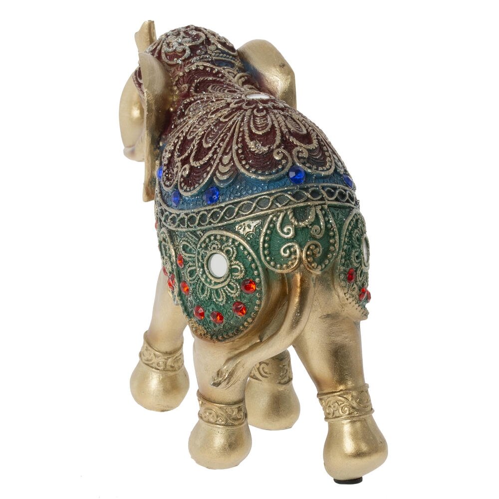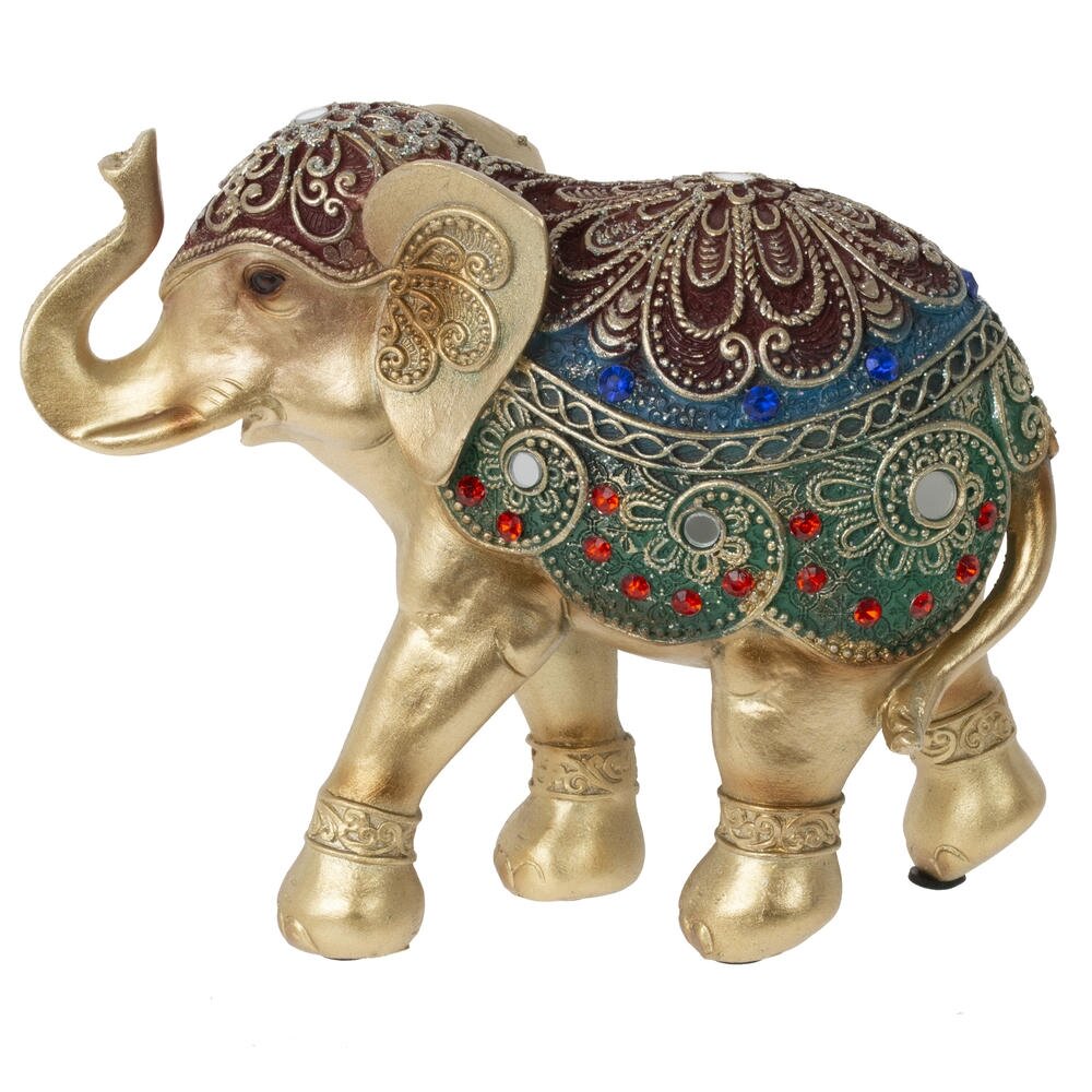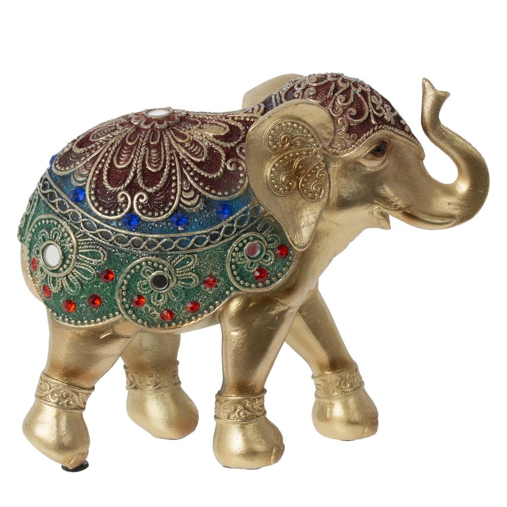 Элегантная декоративная фигурка "Слон" станет изысканным украшением вашего интерьера. Она выполнена из качественных полимерных материалов и имеет детализированную роспись с изящным орнаментом и декоративными вставками. Богатый золотистый оттенок в сочетании с цветными элементами придает изделию роскошный вид, а доработанные мелкие детали создают ощущение восточной изысканности. Слон, поднявший хобот вверх, символизирует удачу, процветание и благополучие, поэтому такая фигурка станет отличным подарком для близких или стильным дополнением к вашему интерьеру. Отлично подойдет для украшения полок, столов или кабинетов, добавляя атмосфере тепла и гармонии.
