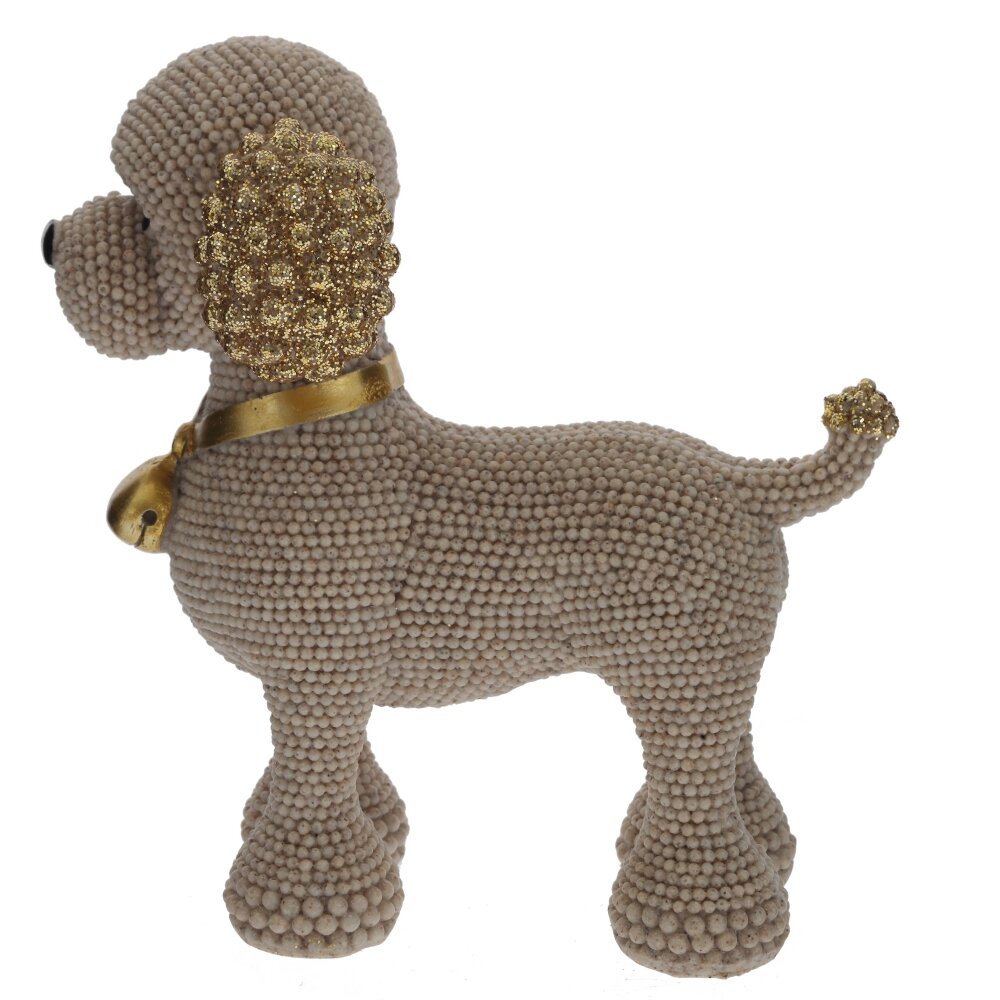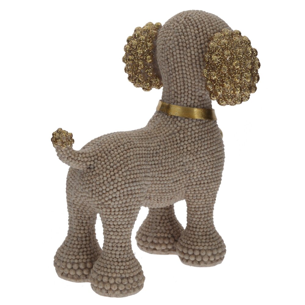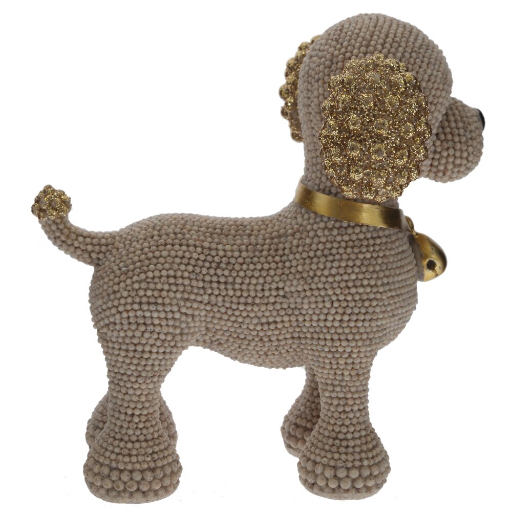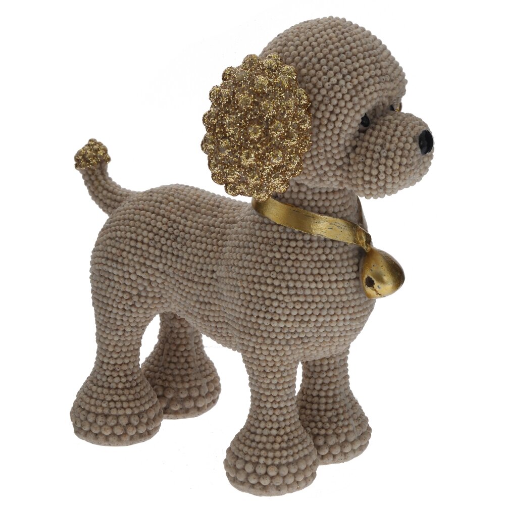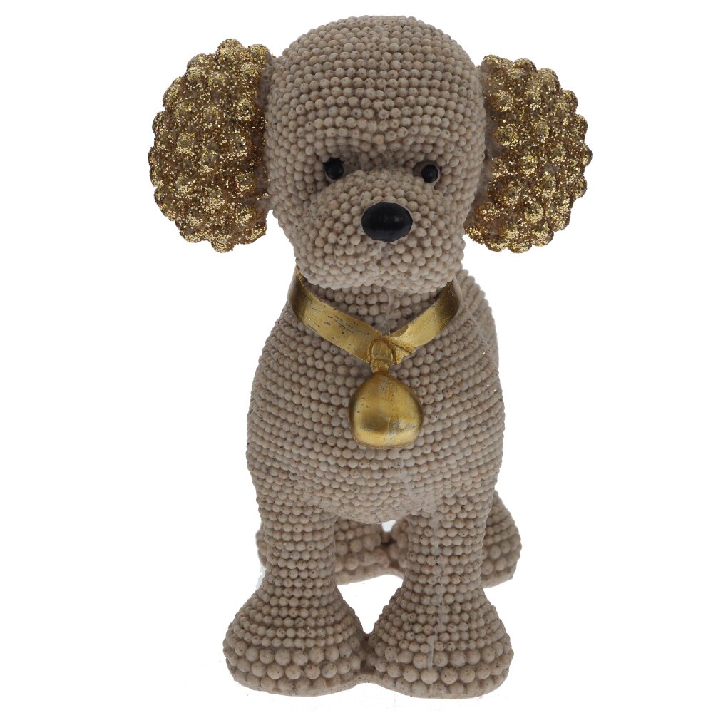 Декоративная фигурка «Собака» из полимерных материалов станет изящным акцентом в любом интерьере. Корпус выполнен в виде аккуратной собачки с необычной фактурой: поверхность покрыта мелкими шариками, создающими эффект ручной лепки и придающими изделию объем. Ушки и хвост украшены золотистым глиттером, на шее – элегантный золотой ошейник с подвеской?колокольчиком, что добавляет фигурке праздничный, нарядный вид. Компактная и устойчивая, она идеально подойдет для полки, каминной полки, рабочего стола или детской комнаты, станет милым подарком любителям собак и оригинального декора.