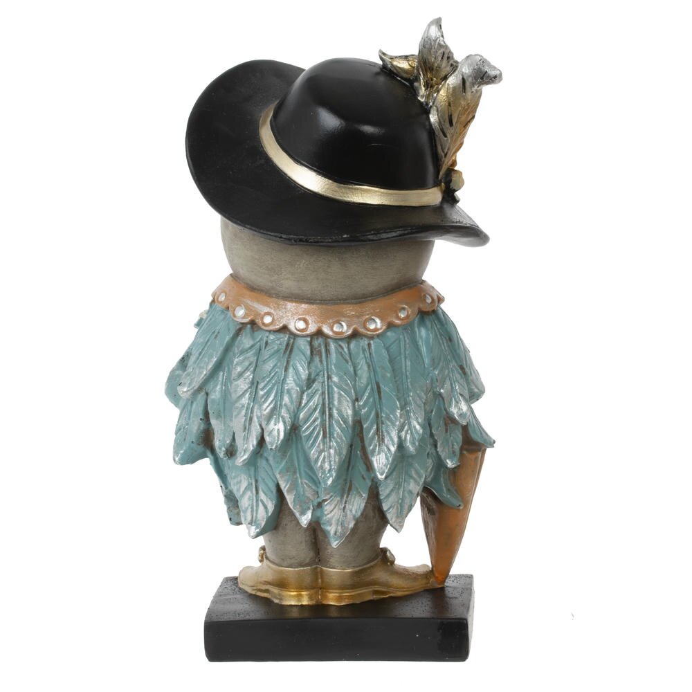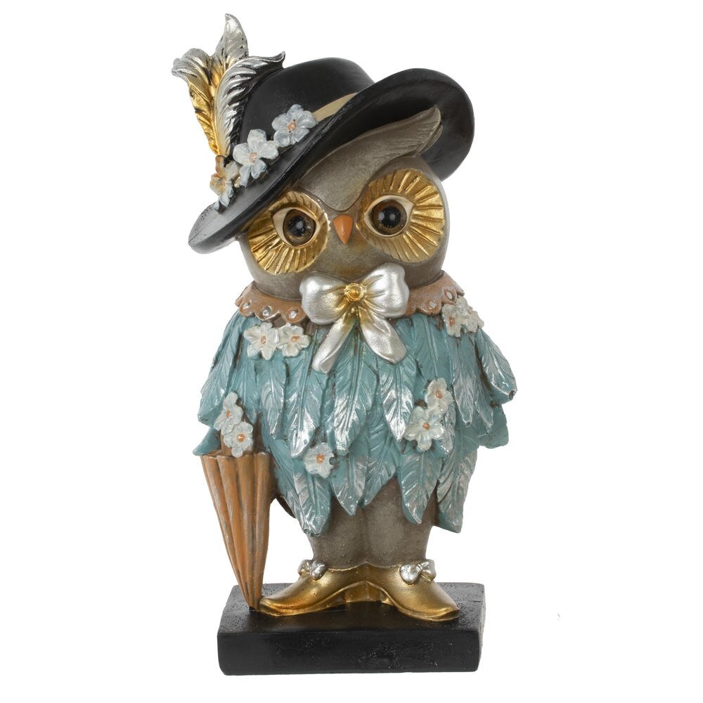 Изящная декоративная фигурка совы станет ярким акцентом в интерьере и оригинальным подарком для ценителей необычных деталей. Сова выполнена в образе светской леди: она стоит на аккуратной подставке, в элегантных золотистых ботиночках, держит зонт и одета в «платье» из резных перьев нежно?бирюзового цвета, украшенных белыми цветами. Особое внимание привлекает стильная шляпка с пером и цветочным декором, а также крупный серебристый бант на шее. Тонкая проработка деталей, сочетание матовых и блестящих золотых оттенков создают ощущение утончённой роскоши. Фигурка гармонично впишется в гостиную, спальню или кабинет, добавив уюта и сказочного настроения, и станет отличным элементом коллекции декоративных статуэток.