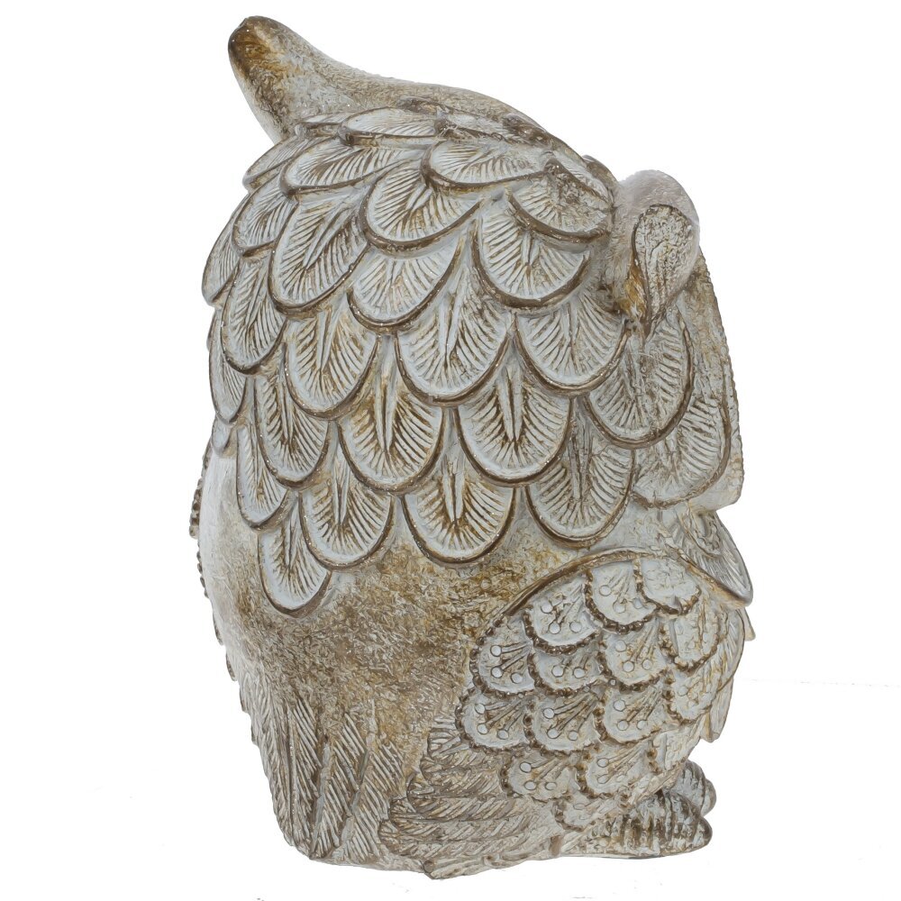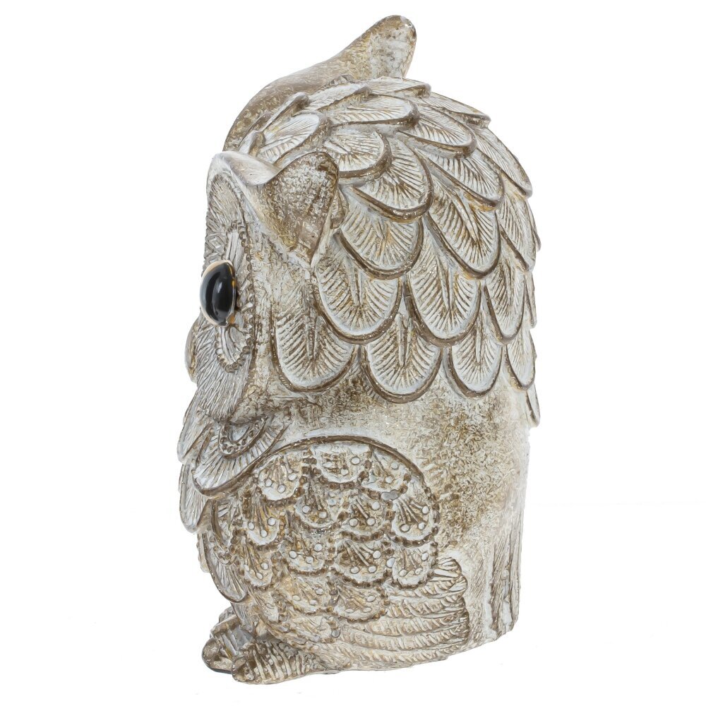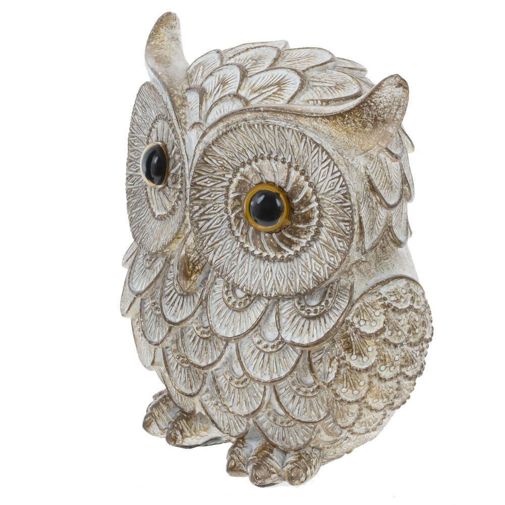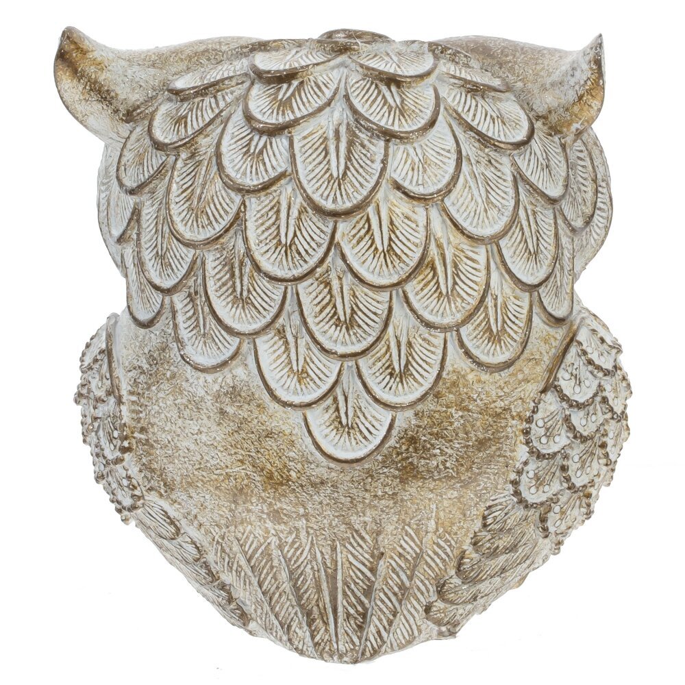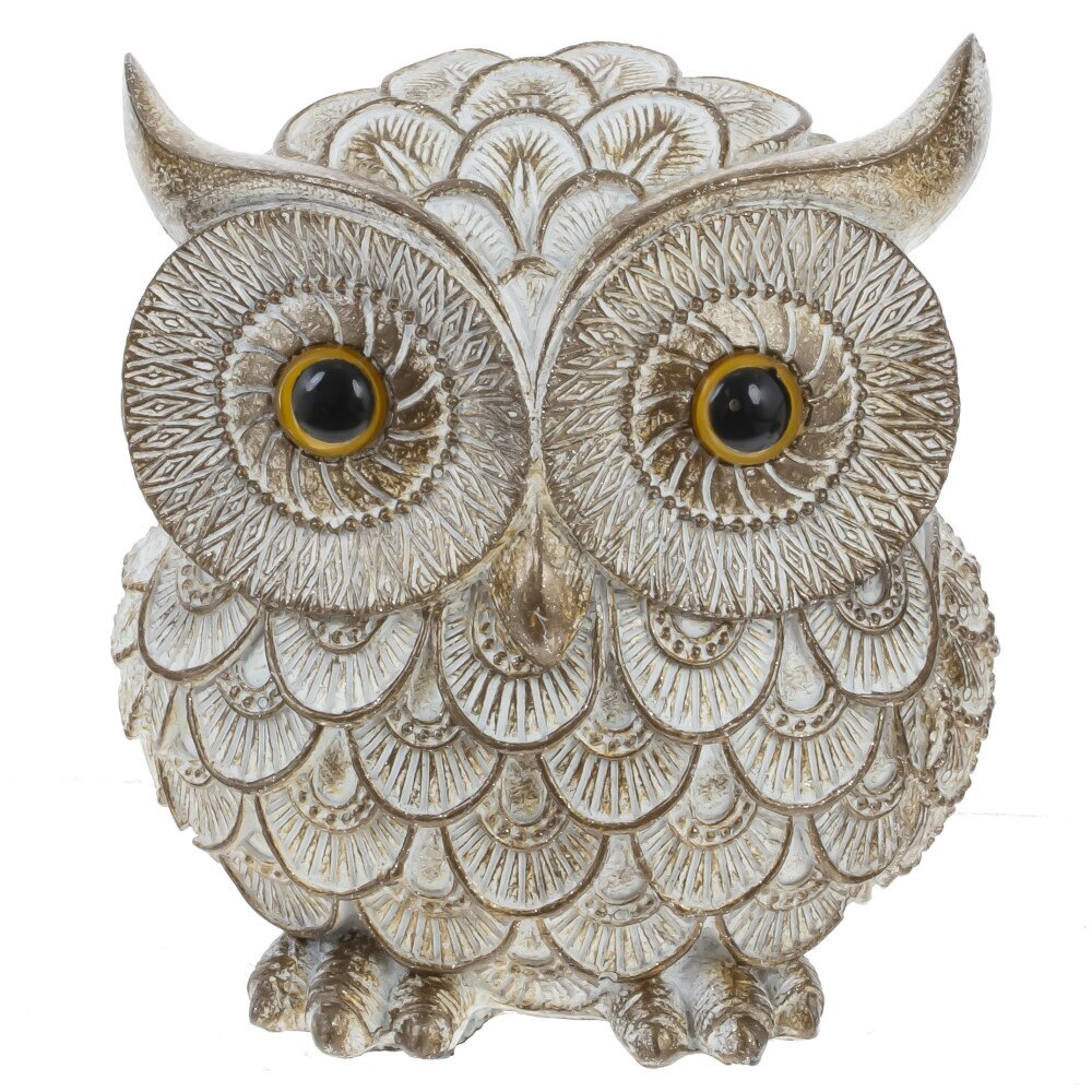 Декоративная фигурка "Сова" выполнена из полимерных материалов и отличается изысканным дизайном. Она представляет собой сову с крупными выразительными глазами, украшённую витиеватым рельефом, имитирующим перья. Светло-золотистый оттенок в сочетании с проработанными деталями придаёт изделию элегантность и оригинальность. Благодаря качественной проработке текстуры, фигурка выглядит очень реалистично и может стать не только украшением интерьера, но и символом мудрости и уюта в доме. Такой аксессуар прекрасно впишется как в классическую, так и в современную обстановку, украсив рабочий стол, книжную полку или камин.