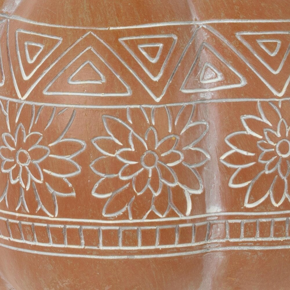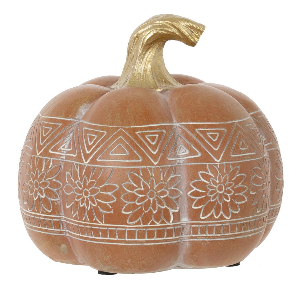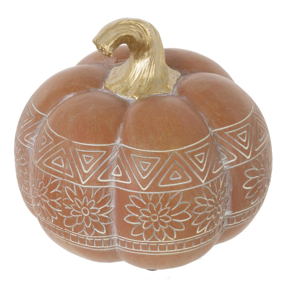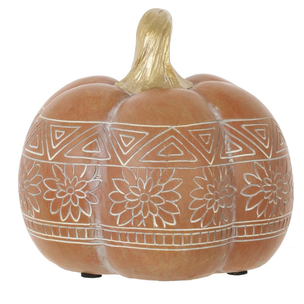 Декоративная фигурка в форме тыквы из качественных полимерных материалов станет ярким акцентом в любом интерьере. Матовая поверхность теплого терракотового оттенка дополнена изящной гравировкой: геометрический орнамент с треугольниками плавно переходит в полосу стилизованных цветов. Контрастный золотистый хвостик придаёт изделию нарядный, немного сказочный вид. Лёгкая, устойчивая и неприхотливая в уходе фигурка идеально подходит для оформления гостиной, кухни, каминной полки или праздничного стола в осеннем стиле, а также для создания уютной композиции с подсвечниками и вазами.