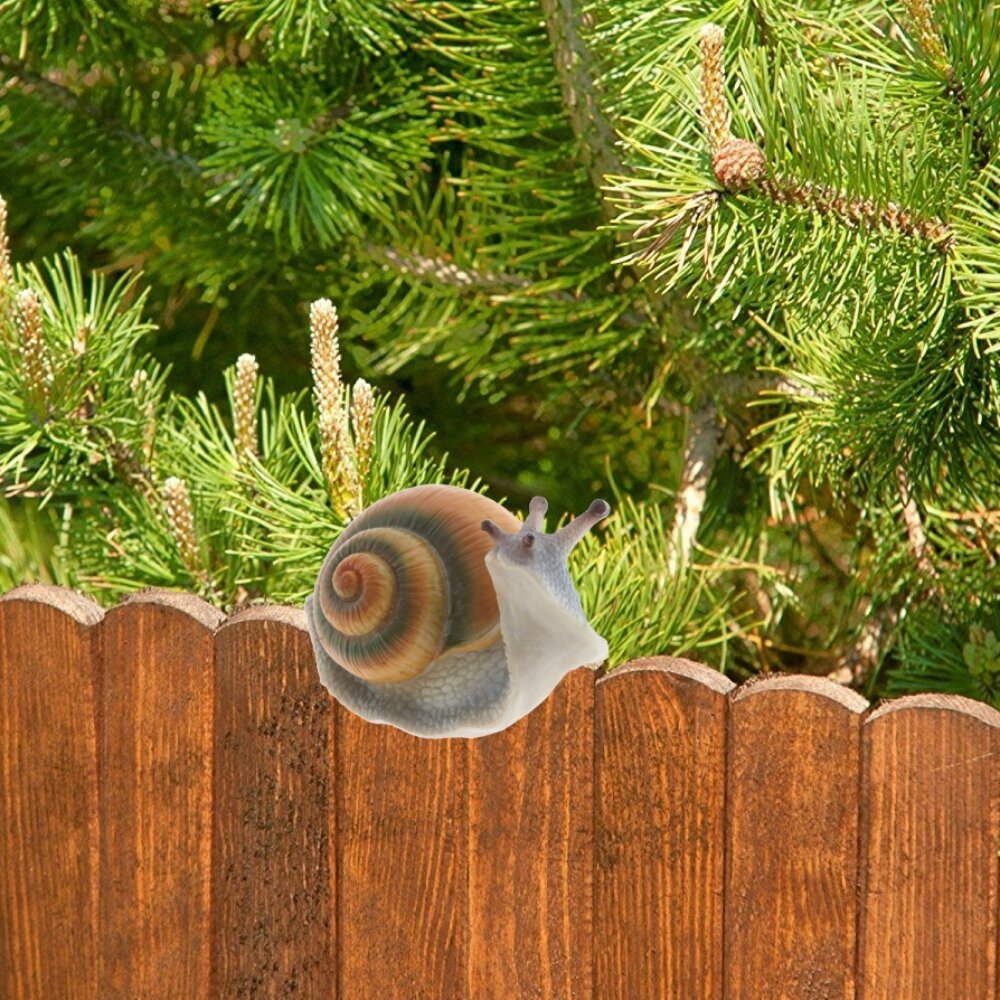 Особенность этой фигурки — специальная выемка, которая позволяет удобно размещать её на различных поверхностях: заборе, ящике, садовой клумбе или даже на декоративных элементах террасы. Благодаря этой конструктивной детали улитка надёжно фиксируется.
