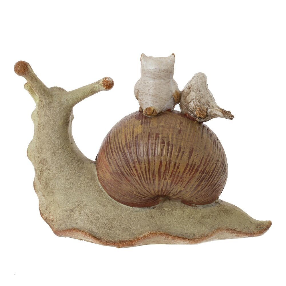 Декоративная фигурка «Улитка» – оригинальный акцент для дома, дачи или сада. На крупном рельефном панцире улитки расположились сова и маленькая птичка, создавая милую сценку дружбы и уюта. Натуральные оттенки коричневого и бежевого, тщательно проработанные детали фактуры и плавные линии делают изделие выразительным и заметным. Фигурка выполнена из прочных полимерных материалов, устойчива к выцветанию и легко очищается от пыли. Подойдёт для оформления подоконника, каминной полки, террасы, а также станет приятным и необычным подарком для любителей садового декора и животных.