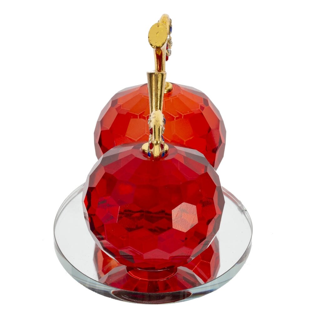 Декоративная фигурка «Вишни» — изящный акцент для интерьера, который привнесёт в пространство яркий цвет и ощущение праздника. Две объёмные ягоды выполнены из прозрачного красного стекла с гранёной поверхностью, благодаря чему фигура красиво переливается и играет бликами при любом освещении. Золотистые веточки с листьями из полимерного материала украшены мелкими декоративными вставками, создающими эффект драгоценных камней. Композиция установлена на аккуратную зеркальную подставку, подчёркивающую блеск и насыщенность цвета. Высота фигурки 6 см — удобный компактный размер для размещения на полке, рабочем столе, туалетном столике или в витрине. Отличный вариант подарка и стильная деталь декора в гостиной, спальне или офисе.