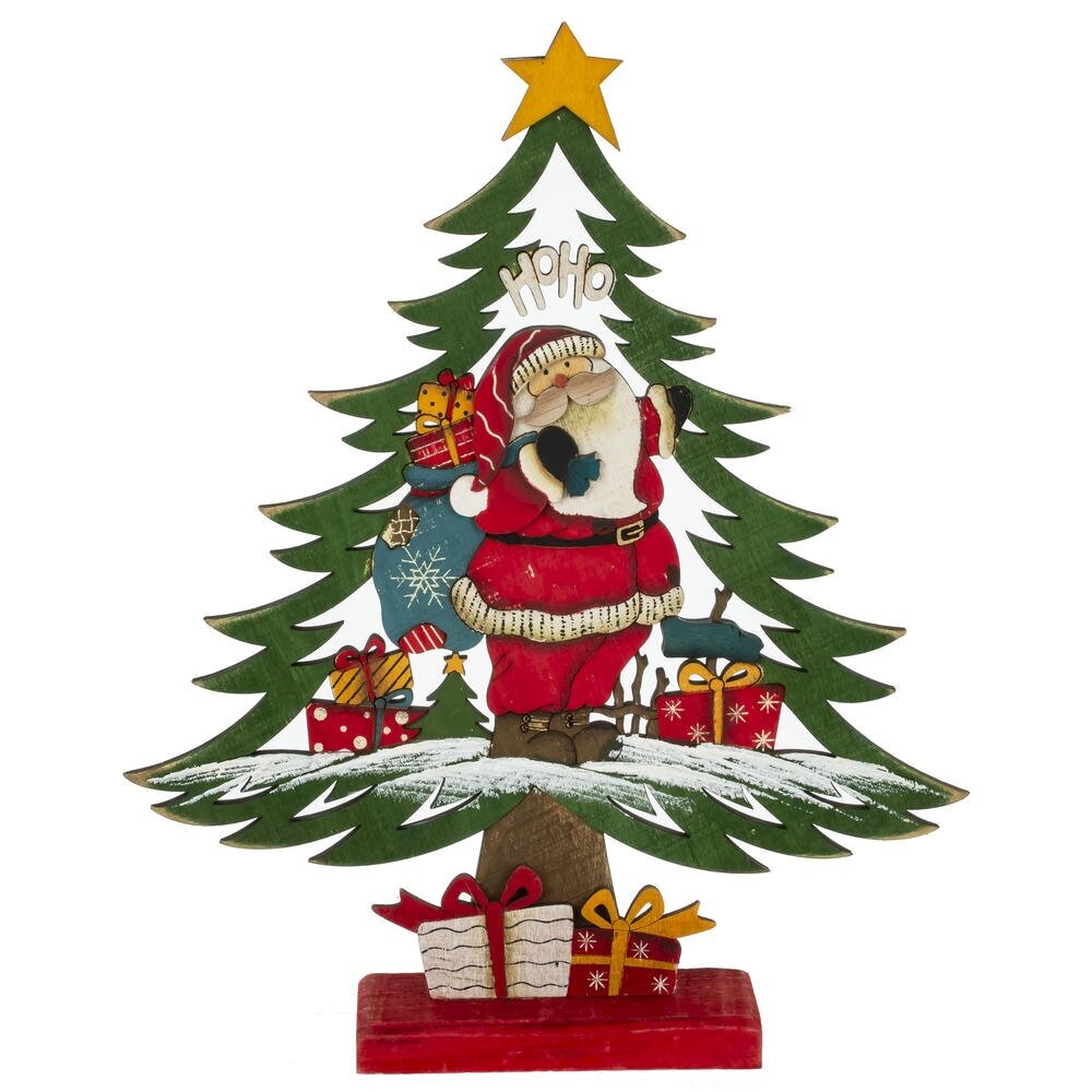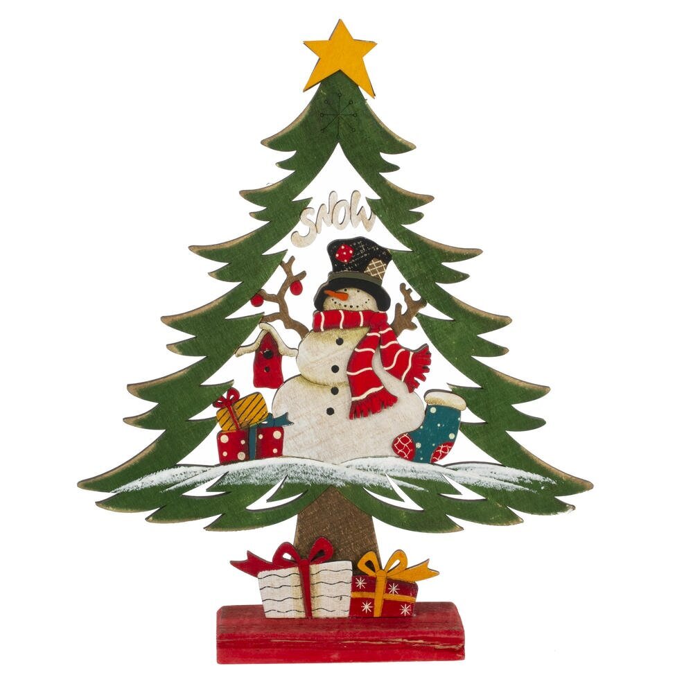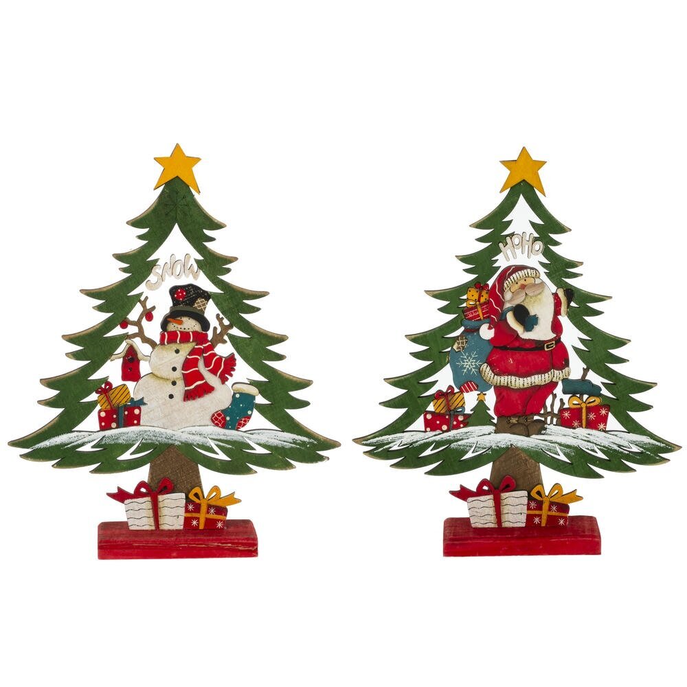 Декоративная фигурка "Ёлка" выполнена из дерева и имеет эффект искусственного состаривания. Представлена в двух вариантах: с Дедом Морозом, который держит мешок с подарками, и со снеговиком в шапке и шарфе. Эти украшения добавят атмосферу праздника и тепла в ваш интерьер, являются отличным акцентом в новогодней декорации.