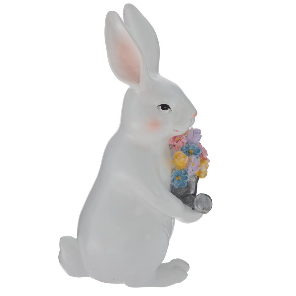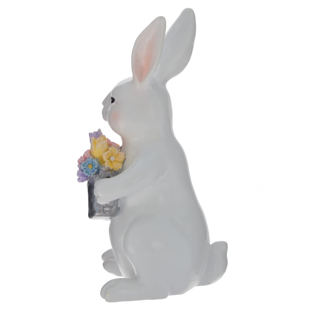 Фигурка Зайчика - прекрасное украшение на время Пасхи. Изделие выполнено из полимерных материалов, что придает ей прочность и долговечность. Особенностью этого белого Кролика является лейка с цветами в его лапках. Фигурка Кролика отлично подойдет для украшения пасхальной корзины, праздничного стола или просто для создания праздничной атмосферы в доме.