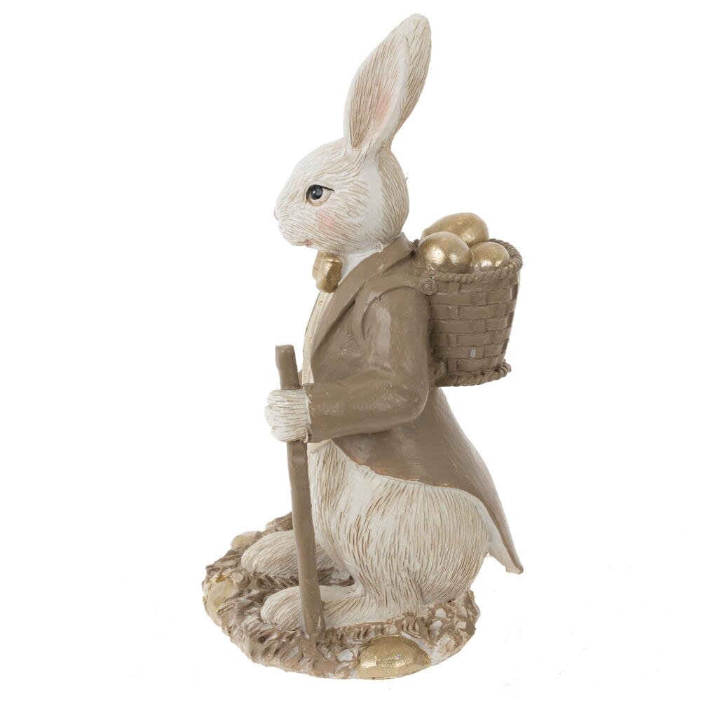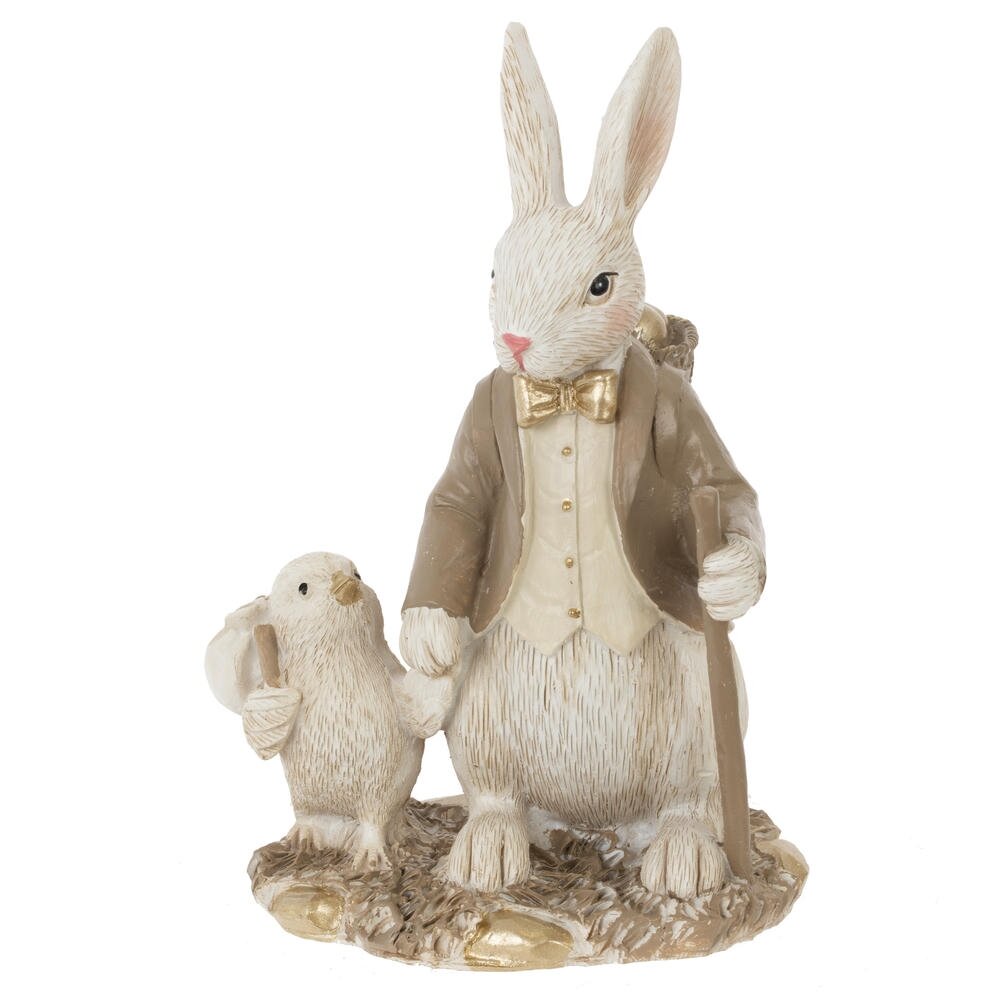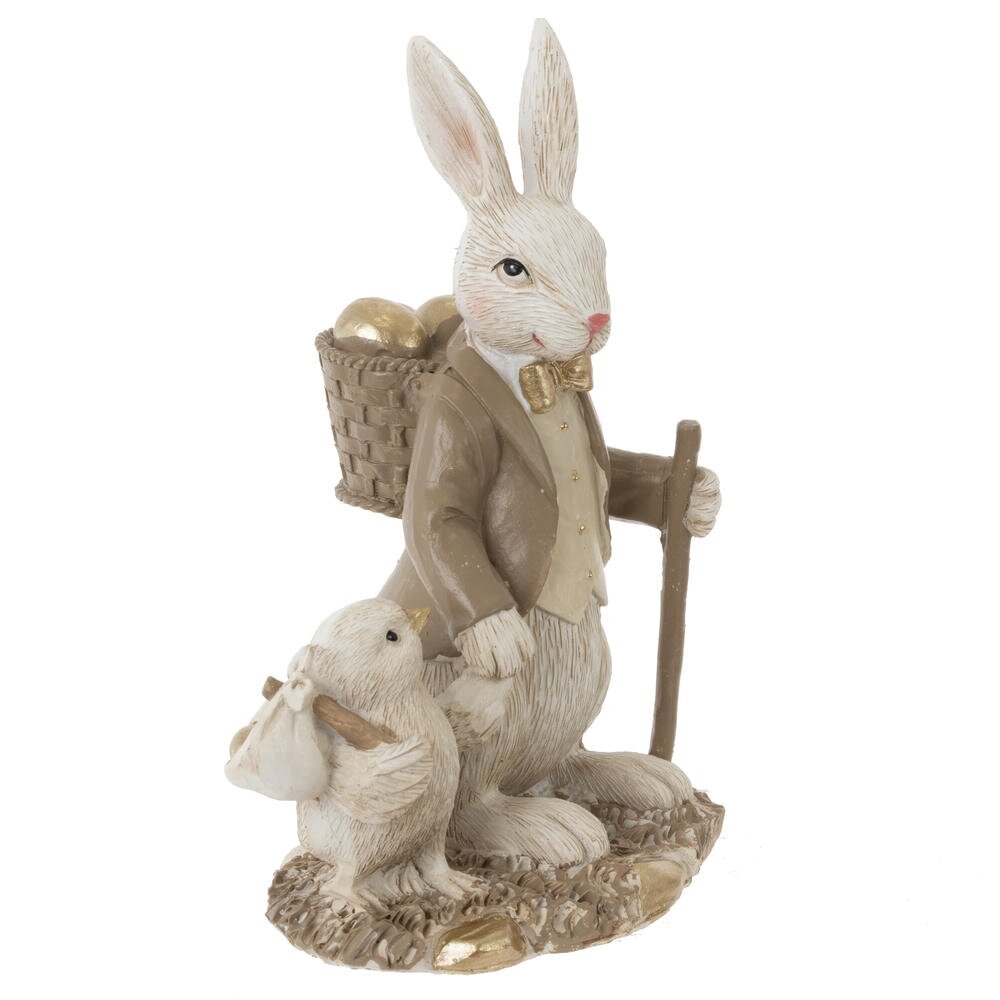 Декоративная фигурка «Пасхальный зайчик с цыпленком» станет трогательным акцентом весеннего интерьера. Композиция изображает элегантного зайца в жилете и пиджаке с золотистой бабочкой и посохом в лапе. Рядом шагает милый птенец с узелком за плечами, доверчиво держась за лапу зайца. Нежные бежевые оттенки и аккуратная позолота на деталях придают изделию изящный, немного винтажный вид. Фигурка выполнена из прочного материала с тщательной проработкой фактуры шерсти и перьев, выглядит как миниатюрная сказочная скульптура. Идеальна для оформления пасхального стола, каминной полки, детской или гостиной, а также в качестве милого подарка к Пасхе и весенним праздникам.