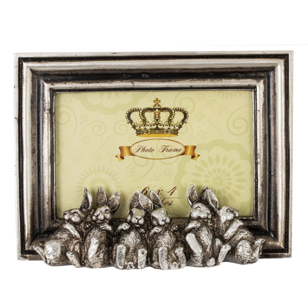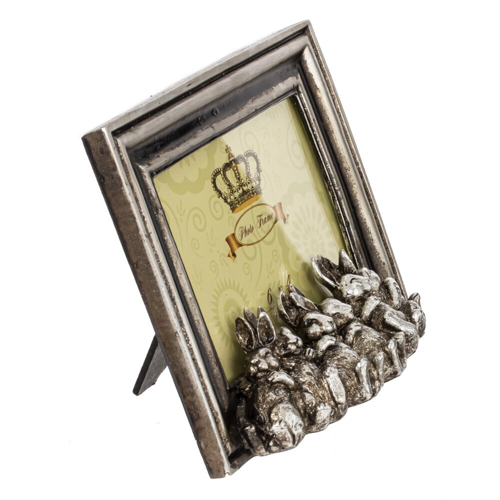 Элегантная фоторамка размером 13х9 см станет прекрасным украшением вашего интерьера. Она выполнена из полимерных материалов с имитацией состаренного серебра, а защитное стекло надежно предохраняет фотографию от пыли и повреждений. Отличительной особенностью дизайна является декоративный элемент в виде симпатичных зайчиков, расположенных в нижней части рамки. Такая фоторамка подойдет для оформления семейных снимков, детских фотографий или памятных моментов, привнося уют и теплоту в ваш дом. Отличный выбор для подарка близким людям.