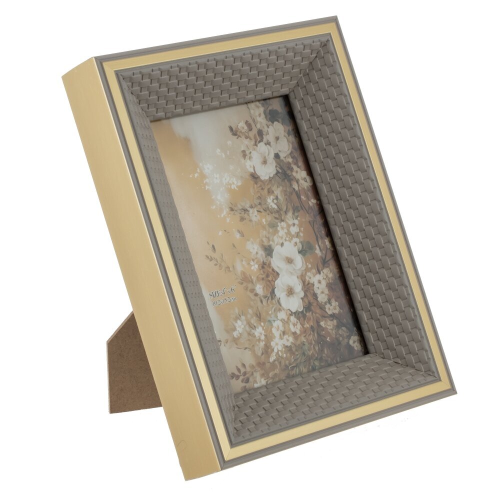 Элегантная фоторамка для фотографии формата 10?15 см. Основа выполнена из прочных полимерных материалов, лицевая часть — из прозрачного стекла, которое надежно защищает снимок от пыли, отпечатков и случайных царапин. Рамка оформлена в спокойном бежево?сером оттенке с выразительной фактурой под плетение и тонкой золотистой окантовкой по периметру, благодаря чему выглядит аккуратно и благородно. Скосы углов подчеркивают глубину, создавая эффект паспарту и красиво фокусируя внимание на изображении. Нейтральная цветовая гамма легко сочетается с классическим и современным интерьером — от гостиной и спальни до кабинета. Идеальна для семейных фотографий, детских портретов или памятных открыток, станет приятным и практичным подарком.