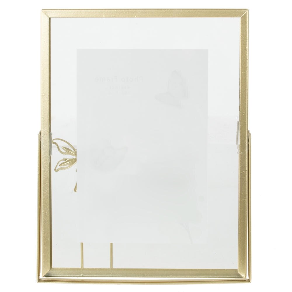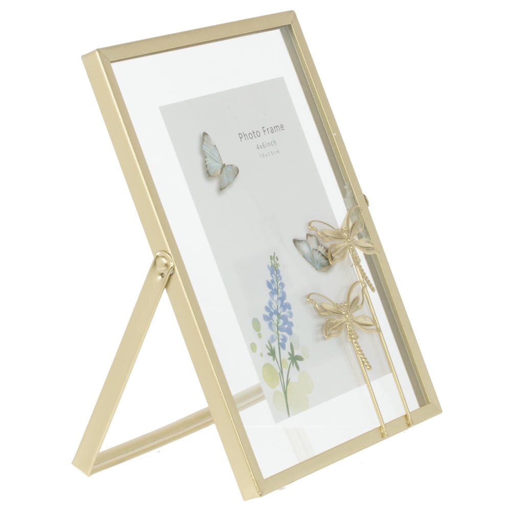 Элегантная фоторамка для фото размером 15?20 см выполнена из стекла и металла, что придаёт ей изысканный и стильный внешний вид. Прозрачное стекло создает эффект "парящей" фотографии, а металлическая окантовка золотистого оттенка добавляет оттенок роскоши и утончённости. Дополнительным украшением являются металлические декоративные элементы в виде стрекоз, придающие рамке романтичный и природный мотив. Такая фоторамка станет замечательным дополнением интерьера, подчеркнёт важные моменты и стильный вкус владельца. Отличный подарок на разные случаи жизни.