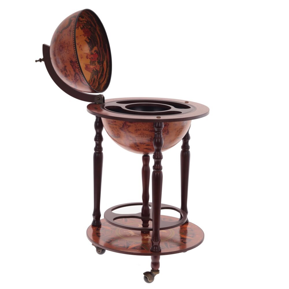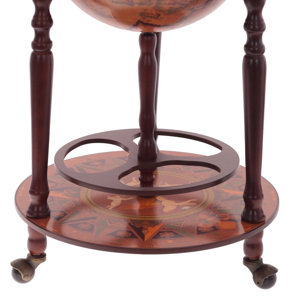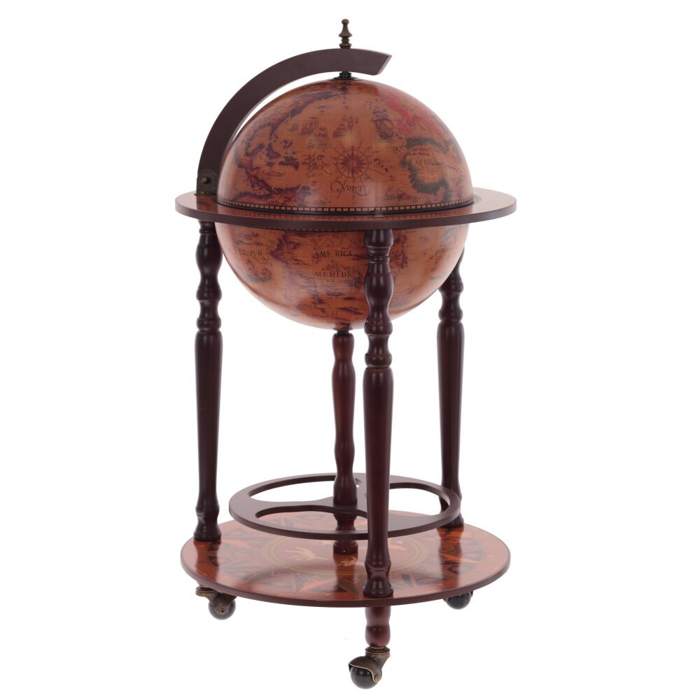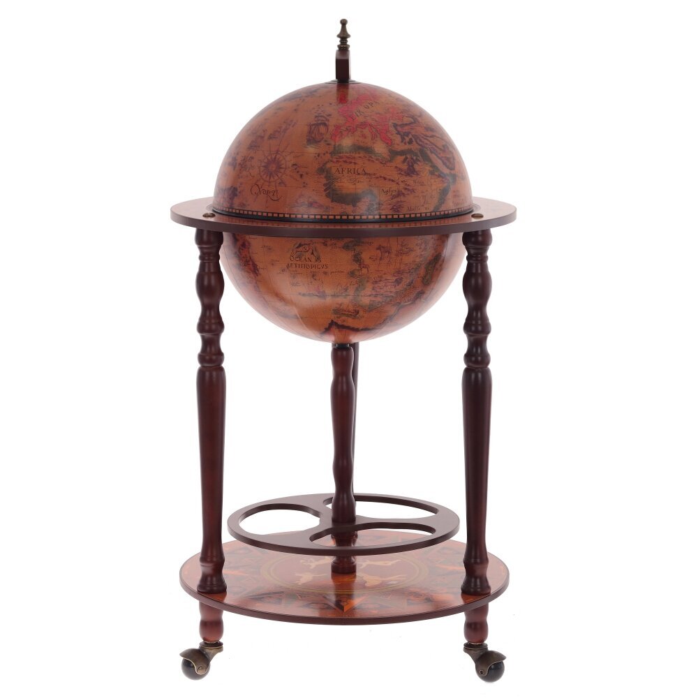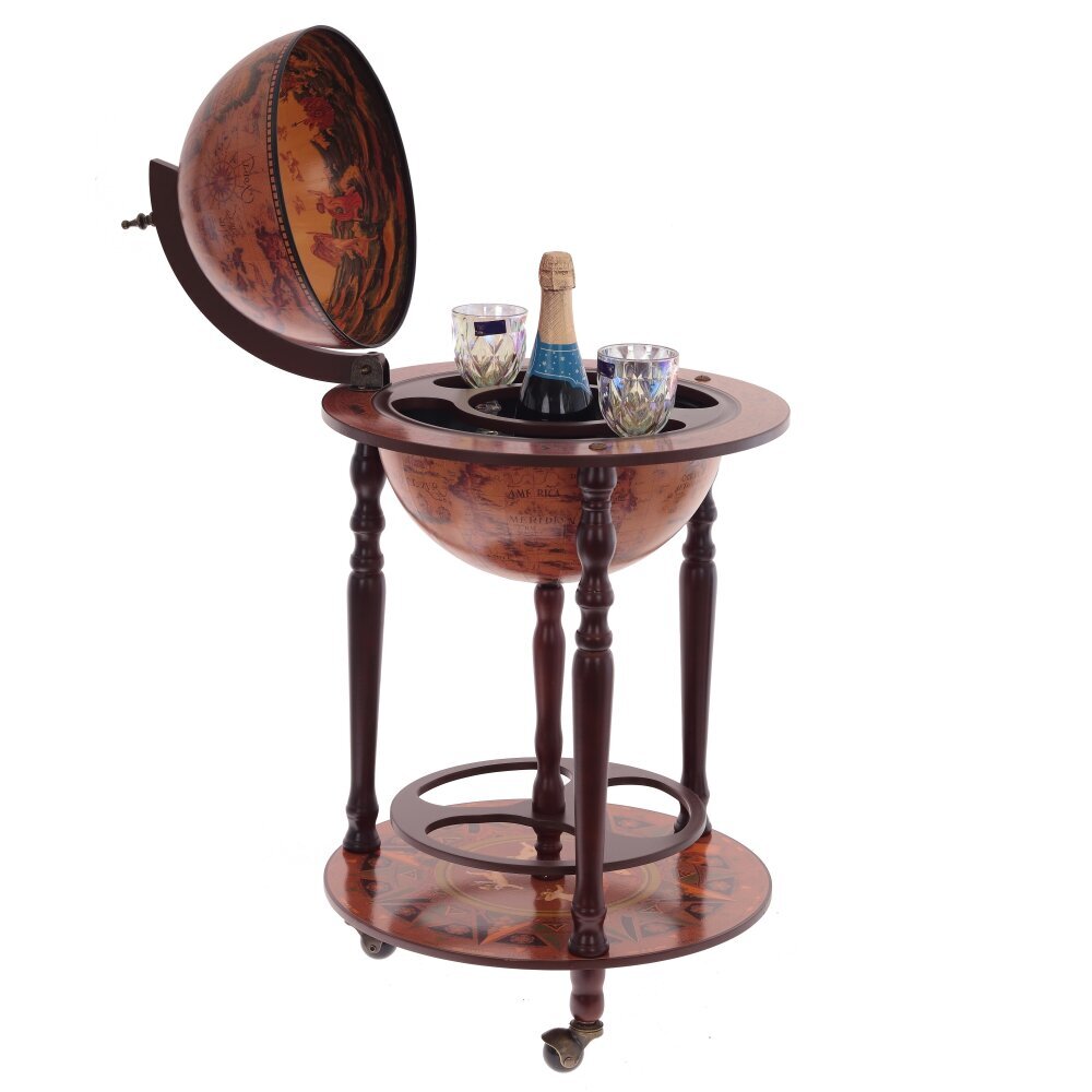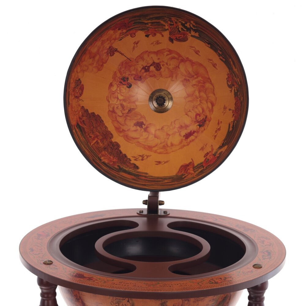 Глобус-бар — это изысканное и стильное решение для хранения и подачи напитков, которое станет украшением любого интерьера. Корпус изделия выполнен из дерева с элементами из высококачественных полимерных материалов и металла, что обеспечивает прочность и долговечность конструкции. Внутри глобуса расположено удобное отделение для бутылок и бокалов, а на нижней полке можно разместить дополнительные аксессуары. Благодаря колесикам бар легко перемещать по комнате. Оригинальный дизайн с картой мира придаёт изделию неповторимый шарм и делает его отличным подарком для ценителей эксклюзива и классики.