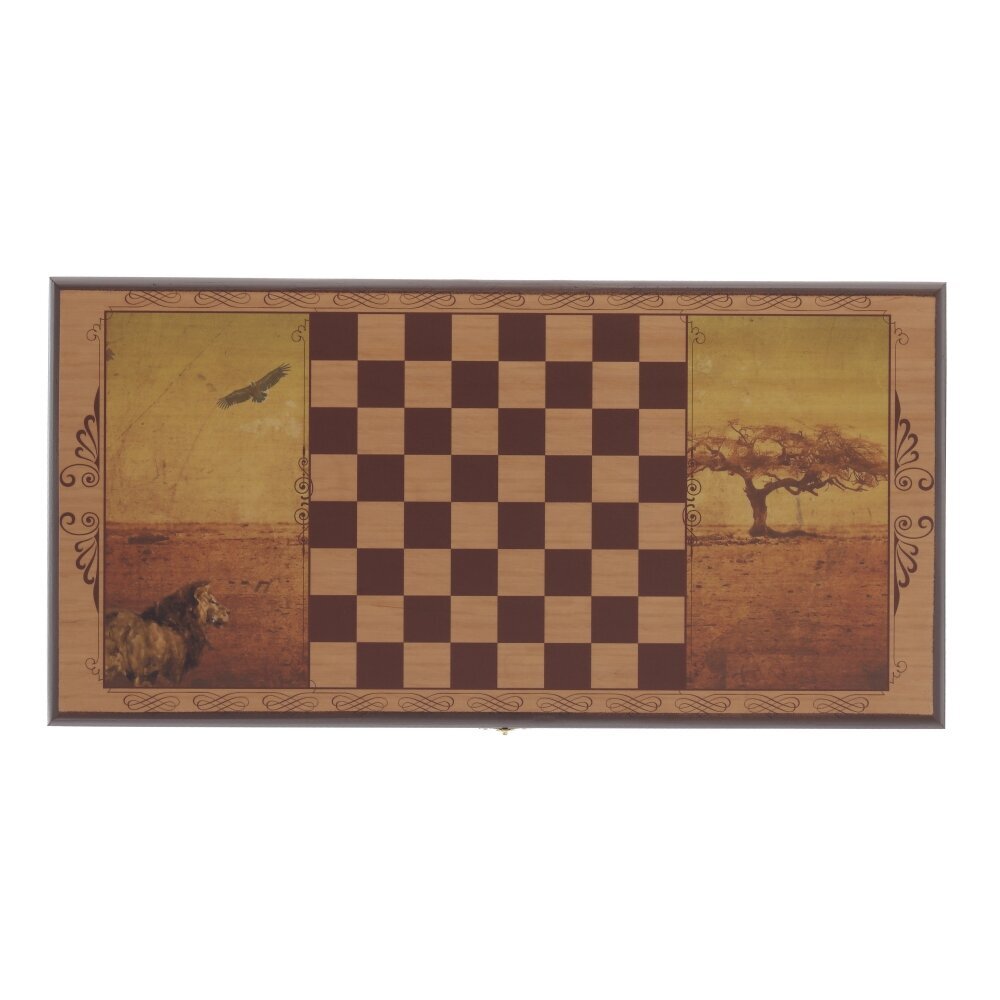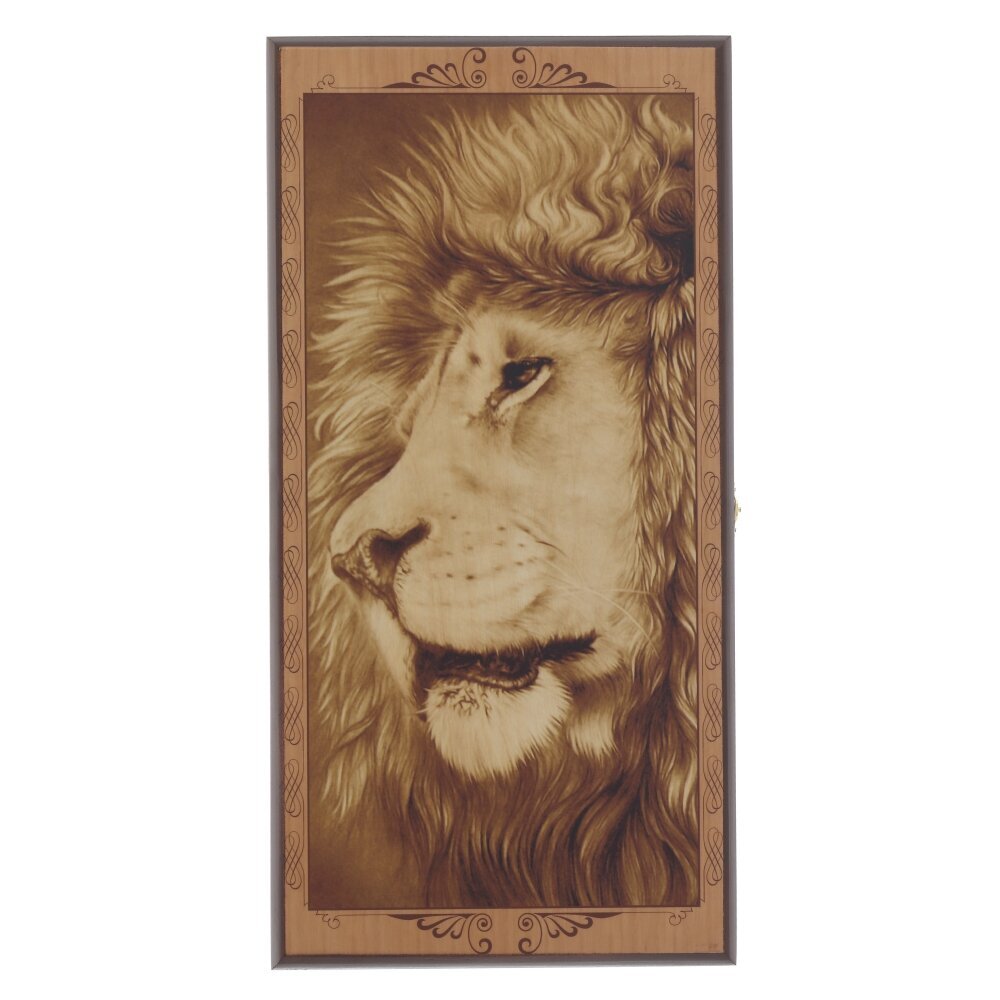 Настольная игра 2 в 1 (шашки и нарды) «Лев» из натурального дерева. Корпус выполнен в виде раскладного футляра, на крышке — выразительный портрет льва, обрамлённый тонким орнаментом. Размеры L50 ? W25 ? H3 см делают набор удобным для хранения и поездок. Прочные петли и аккуратная металлическая защёлка надёжно фиксируют створки. Внутри и снаружи — разметка для шашек и классическая доска для нард с гладкой, хорошо отшлифованной поверхностью, обеспечивающей лёгкий ход фишек. Эстетичный и практичный подарок, который украсит дом и поможет с удовольствием провести время с семьёй и друзьями.