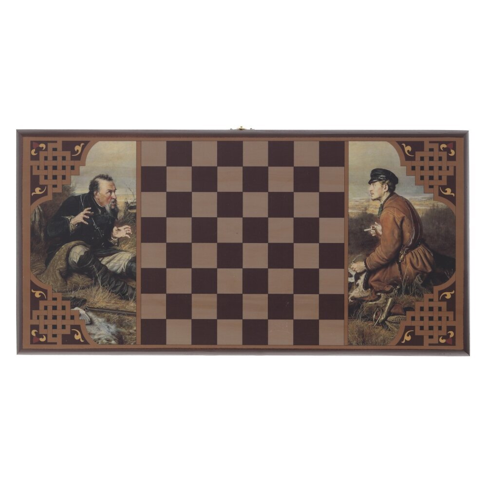 Настольная игра 2 в 1 (шашки и нарды) с оформлением «Охотники на привале» — эффектный и практичный набор для домашнего досуга. На крышке — детальная репродукция известного охотничьего сюжета с тёплой палитрой и декоративными уголками, создающими винтажный характер. Корпус выполнен из дерева, что придаёт изделию прочность и приятную тактильность. Двусторонняя доска экономит место: одна сторона предназначена для шашек, другая — для игры в нарды. Компактные габариты L50 ? W25 ? H3 см позволяют удобно хранить набор и брать его с собой на дачу или в поездки. Такой комплект подойдёт для семейных вечеров, станет украшением интерьера и солидным подарком ценителям классики и логических игр. Дерево, продуманный дизайн и универсальность делают эту игру долговечным и стильным приобретением.