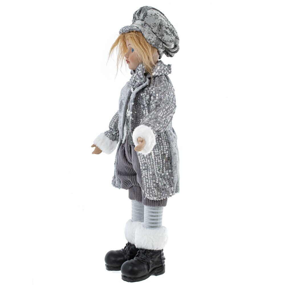 Интерьерная новогодняя игрушка "Мальчик" привносит в праздничную обстановку неповторимую атмосферу волшебства. Ее высота в 45 см делает ее заметным акцентом декора. Голова изящно выполненая из фарфора, добавляет игрушке выразительности. Кисти рук и ботиночки сделаны из полимерных материалов. Примечательно, что рукам данной игрушки можно придавать различные позы. Длинная челка из под берета, создает неповторимый образ, а праздничный камзол серого цвета расшитый пайетками, в сочетании с кюлотами, жилетом и бабочкой подчеркивают стиль и изысканность игрушки. На спине расположен заводной ключик, активирующий рождественскую мелодию и движение головы, что делает эту куклу особенно впечатляющей и привлекательной для гостей и хозяев праздника.
