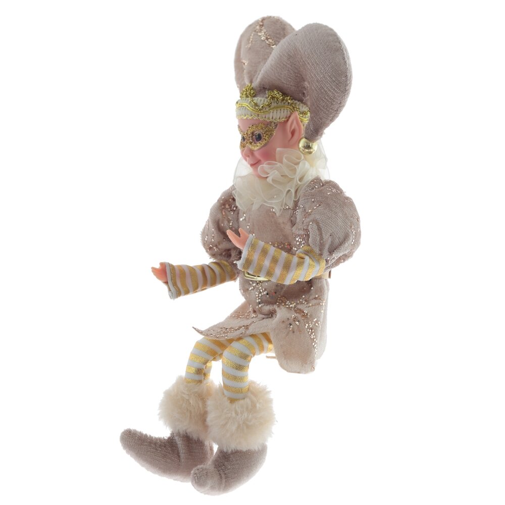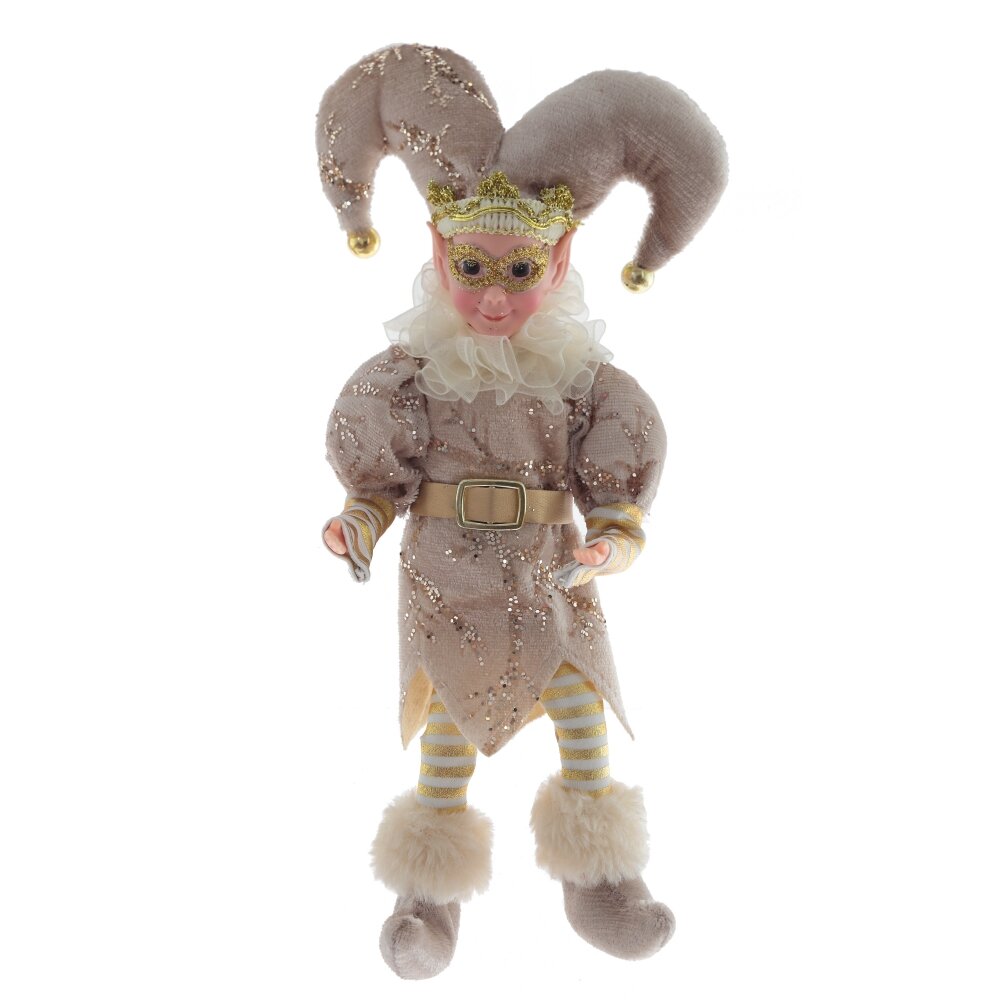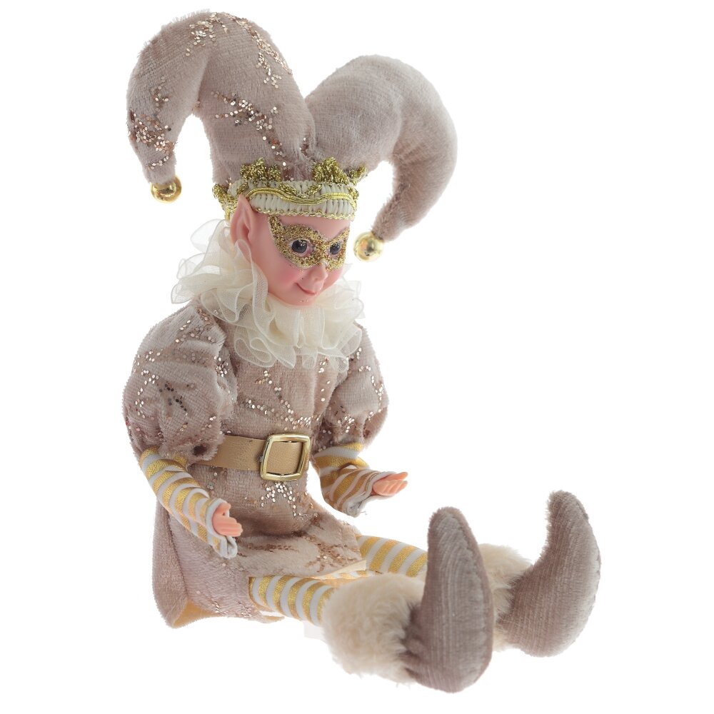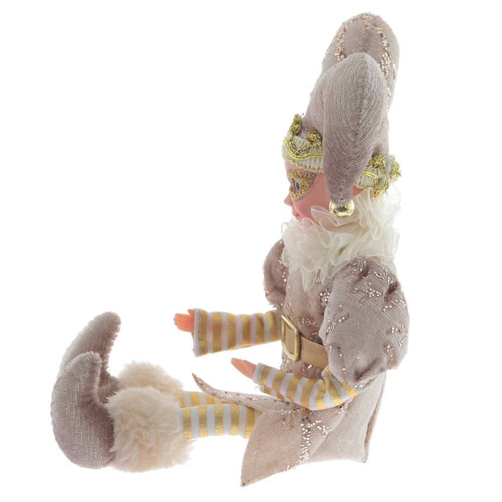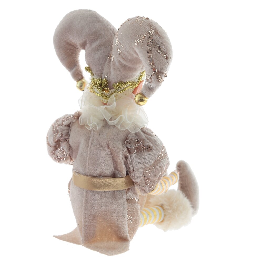 Наряд цвета шампань с золотыми элементами делает этого клоуна неотразимо элегантным и изысканным. Шутовской колпак с бубенчиками завершает образ и добавляет клоуну дополнительного очарования.