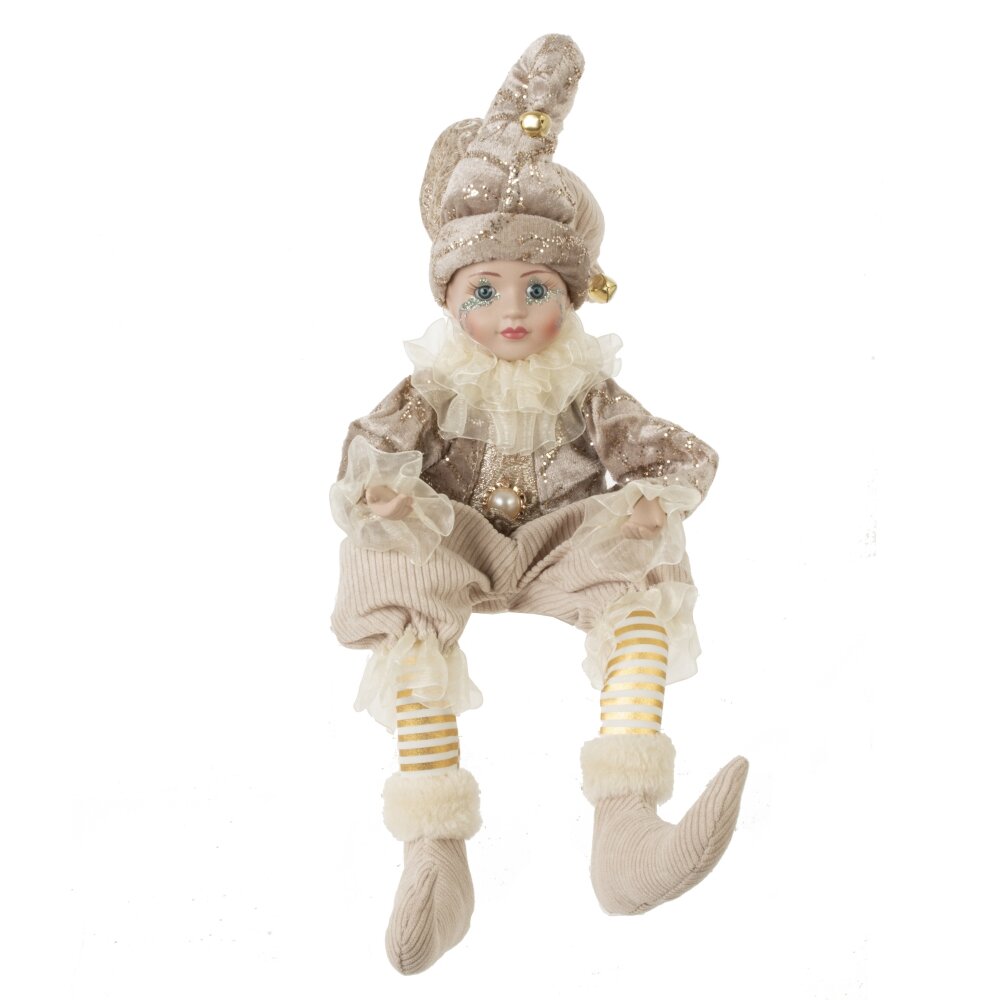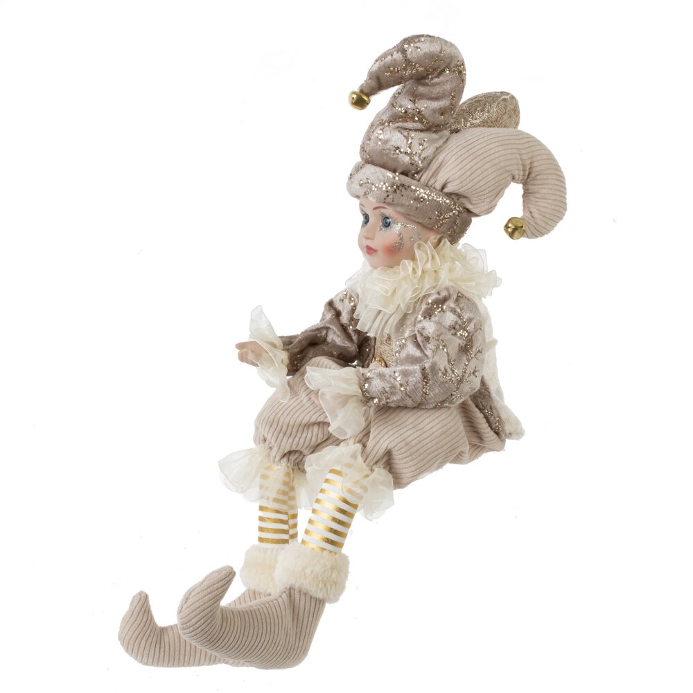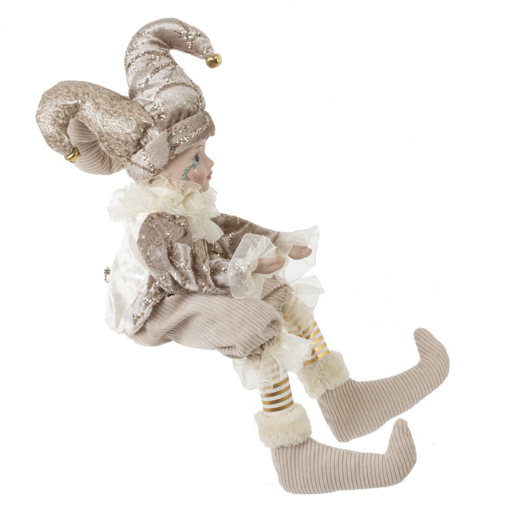 Игрушка набивная "Клоун" – великолепное новогоднее украшение для интерьера. Голова клоуна, изготовленная из фарфора, выглядит ярко и выразительно. Его одежда из текстиля в нежном бежевом оттенке придает игрушке благородный вид. Шутовской колпак на голове украшен тремя веселыми бубенчиками, что добавляет игрушке игривости. Камзол украшен золотым узором, подчеркивающим его карнавальный облик. Гибкие руки и ноги позволяют придать клоуну различные позы, делая его еще более живым и ярким элементом декора.