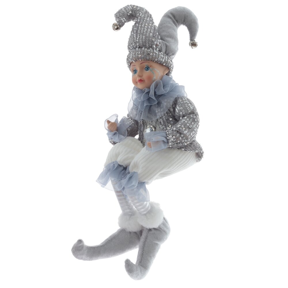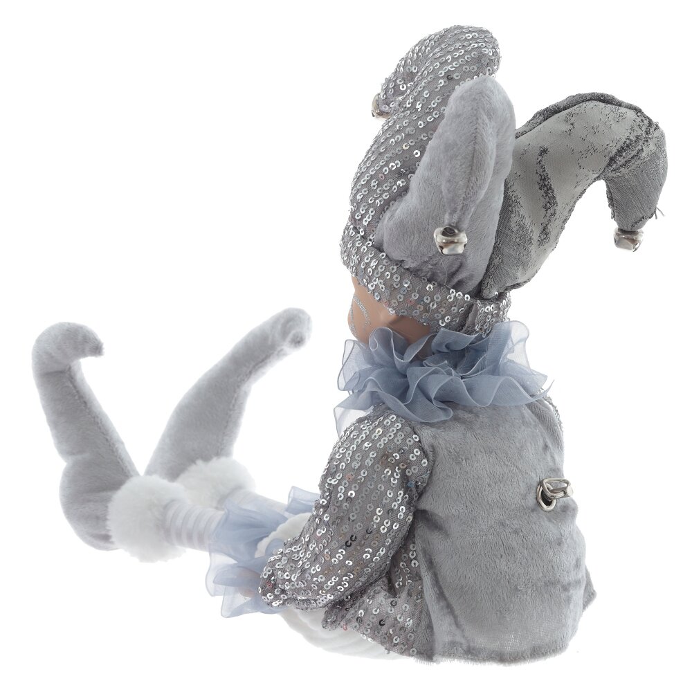 Игрушка набивная "Клоун" – интерсное новогоднее решение для украшения интерьера. Фарфоровое лицо клоуна выглядит очень выразительно. Одежда выполнена из нежного бархатного текстиля в серых тонах. Камзол расшит пайетками, а шутовской колпак с тремя бубенчиками и жабо добавляют этой игрушке карнавальный облик. Гибкие руки и ноги игрушки позволяют создавать различные позы, что делает его еще более живым и привлекательным элементом декора.
