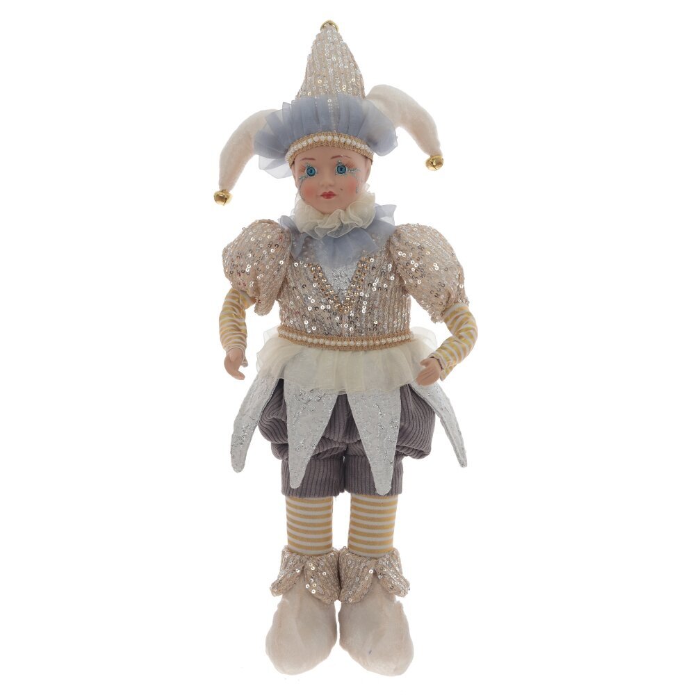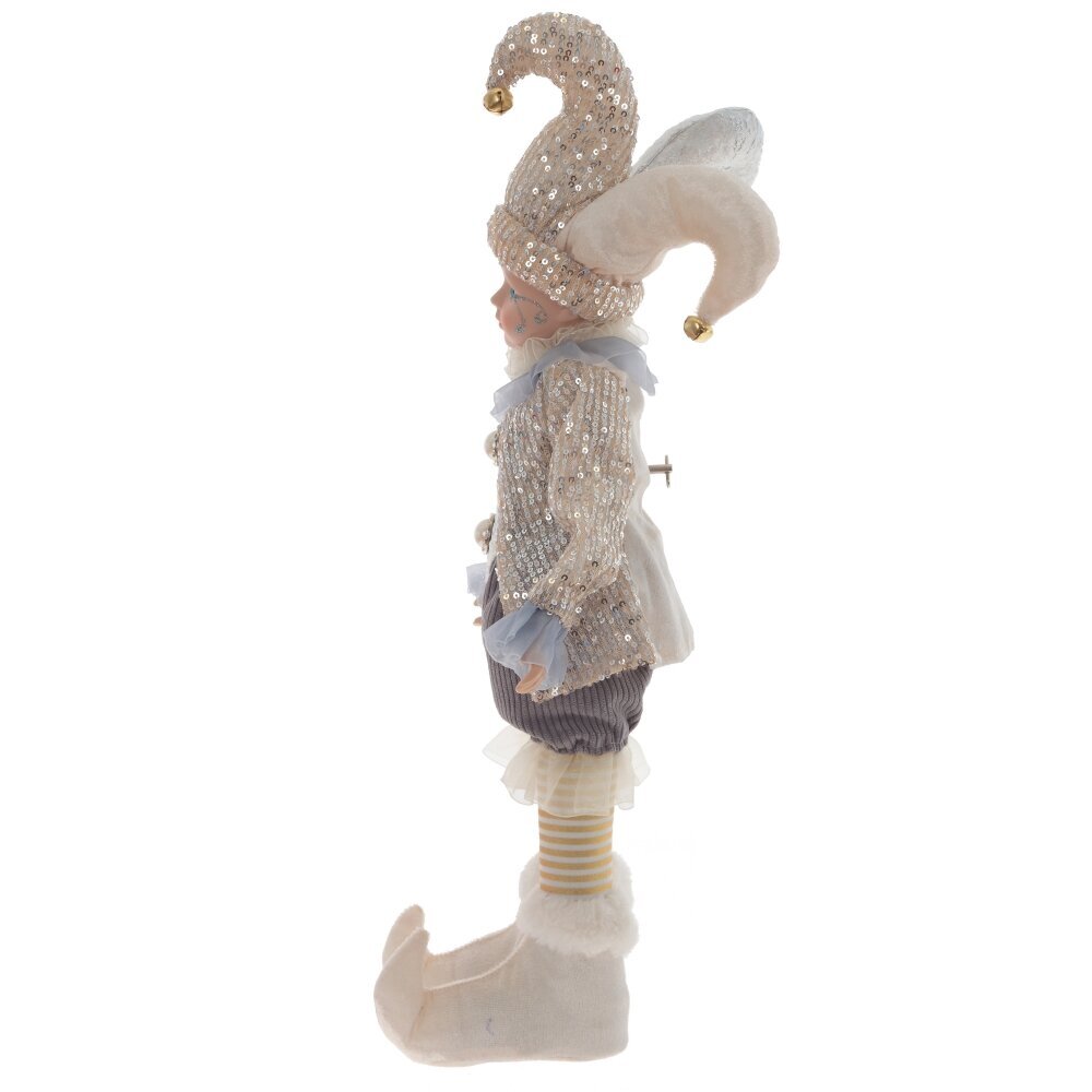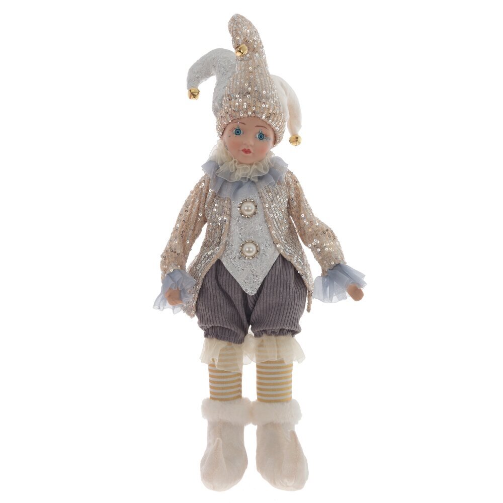 Игрушка набивная с музыкальным и движущимся механизмом "Клоун" — это восхитительная декоративная кукла, которая станет незаменимым акцентом на любом празднике. Лицо и кисти рук выполнены из фарфора, что придаёт ей неповторимую элегантность и утонченность. Костюм клоуна выполнен в роскошных сер-золотых оттенках, которые эффектно переливаются на свету. Шутовской колпак придает образу веселья. Благодаря проволоке, встроенной в руки, клоун может делать забавные жесты, что добавляет игривости в атмосферу праздника. На спине куклы расположен заводной ключик, который активирует новогоднюю мелодию, под которую клоун плавно кивает головой. Эта яркая игрушка не только станет прекрасным подарком для близких, но и замечательным элементом интерьера. Представлен в двух вариантах.