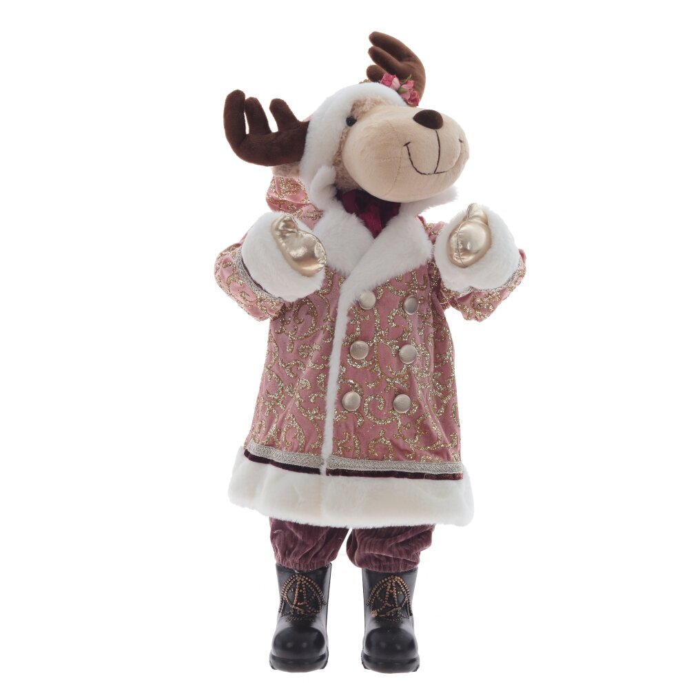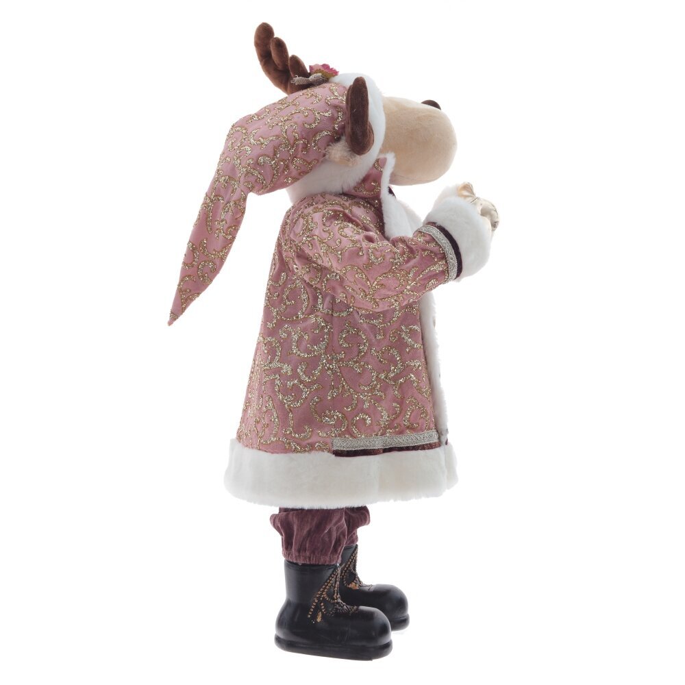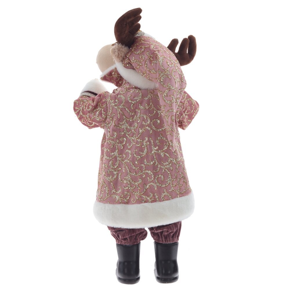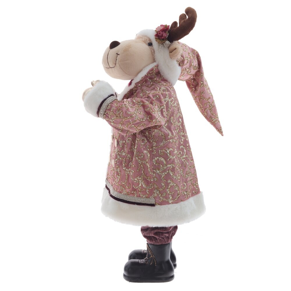 Игрушка набивная "Олень" представляет собой милую девочку-олененка в нежно розовом пальто с зототым узором и меховой отделкой. Длинный колпак в цвет пальто, цветок на рожках, варежки и сапожки придают образу особый шарм. Она станет изысканным акцентом в любом интерьере — будь то стильная гостиная, уютная детская комната или праздничный уголок, украшенный к Новому году.