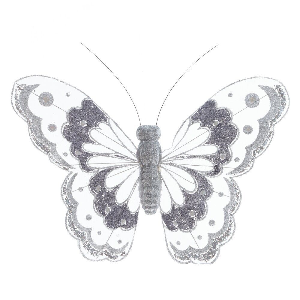 Элегантное декоративное изделие в форме бабочки выполнено в нежном белом цвете с утонченными серебристыми деталями, придающими блеск и изысканность. Благодаря удобной клипсе бабочку легко закрепить на шторах, елке, подарочной упаковке, венках или других элементах интерьера. Легкая конструкция делает её универсальным украшением для праздников, торжеств или повседневного декора. Отлично впишется в любую цветовую гамму, добавляя лёгкость и изящество композиции.