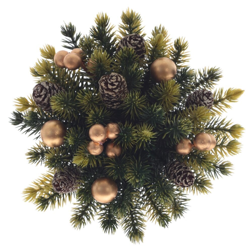 Декоративное изделие "Елка в кашпо" представляет собой искусственные еловые веточки в кашпо с украшениями: шишками и ягодами. Его небольшой размер позволяет украсить подоконники, полки или разместить на столе, придавая интерьеру праздничное настроение. Пусть ваш дом наполнится праздничным настроением с этой миниатюрным декором. Представлено в двух вариантах с белыми и золотыми ягодами.
