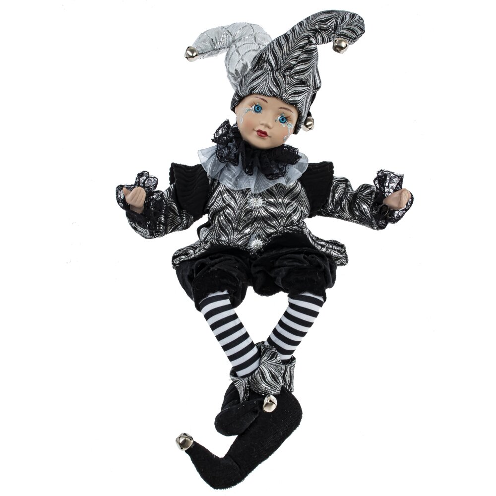 Игрушка набивная "Клоун" – интерсное новогоднее решение для украшения интерьера. Фарфоровое лицо клоуна выглядит очень выразительно. Одежда выполнена из нежного бархатного бархата и парчи в черно-серых тонах. Сорочка украшена двумя жемчужными поговицами, а шутовской колпак с бубенчиками и жабо на шее добавляют этой игрушке карнавальный облик. Гибкие руки и ноги куклы позволяют создавать различные позы, что делает его еще более живым и привлекательным элементом декора.