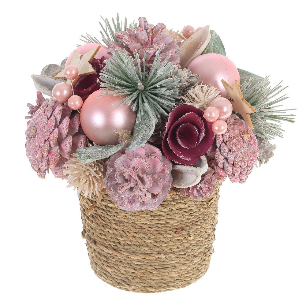 Изделие декоративное "Новогодняя композиция" в кашпо. Кашпо из плотного картона оформлено джутовой веревкой. Композиция из натуральных шишек, искусственных цветов, листьев, веток и шаров будет дарить праздничное настроение в новогодние праздники.