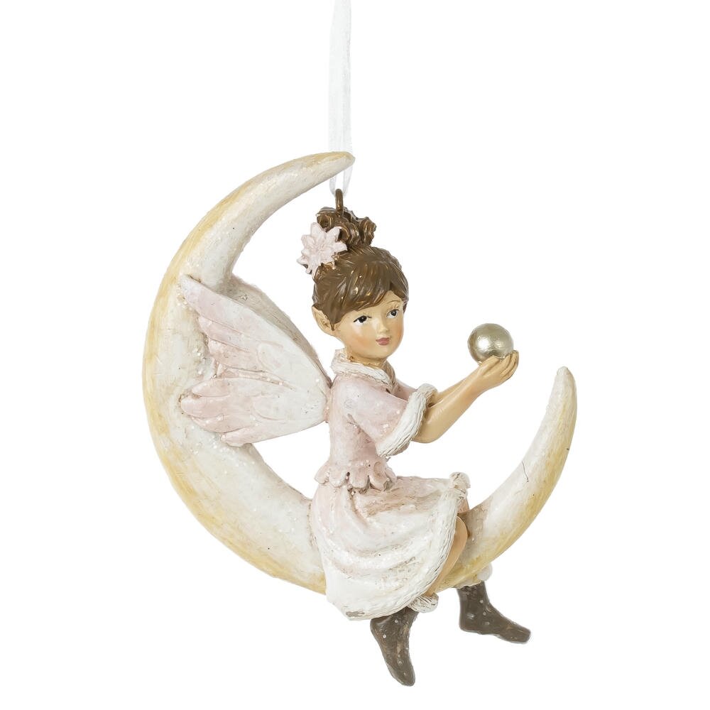 Декоративное подвесное изделие "Фея" выполнена из качественного полистоуна. Маленькая девочка с крылышками феи сидит на полумесяце, Каждая деталь тщательно проработана: прическа украшена цветами, а платье выглядит невероятно нежно. В руках у девочки золотой шар. Это восхитительное елочное украшение станет прекрасным дополнением новогоднего декора и милым подарком для близких, пробуждая атмосферу сказки и радости.