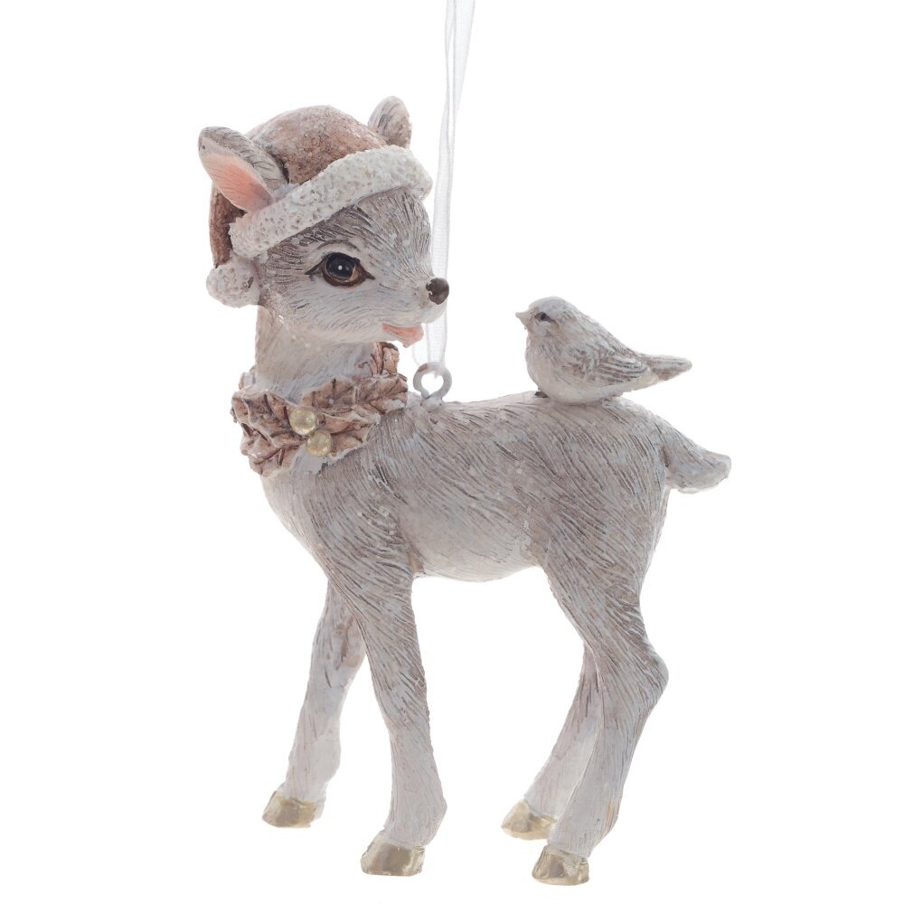 Декоративное подвесное украшение из полистоуна в виде олененка привлекает внимание своим изысканным исполнением и вниманием к деталям. Олененок, одетый в милую шапочку, с нежным взглядом смотрит на маленькую птичку, устроившуюся у него на спине. Пастельные тона и изящная форма создают атмосферу уюта и гармонии, наполняя ваше пространство новогодним волшебством. Эта фигурка станет ярким акцентом на елке, добавляя нотку сказки и тепла в праздничный декор.