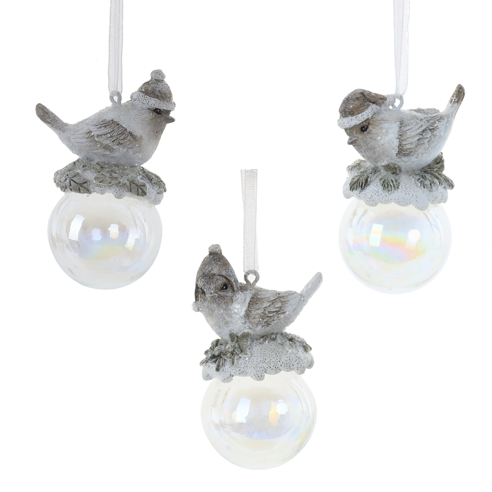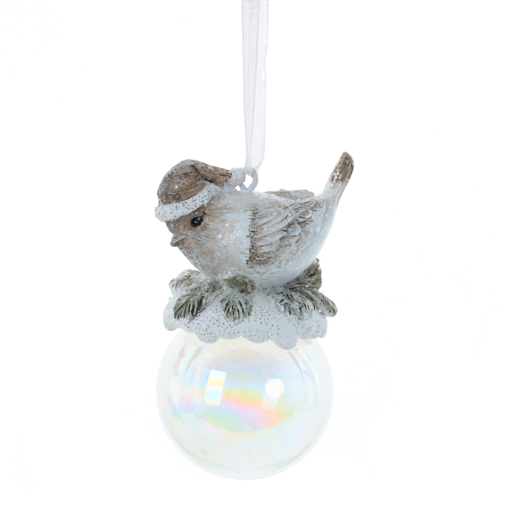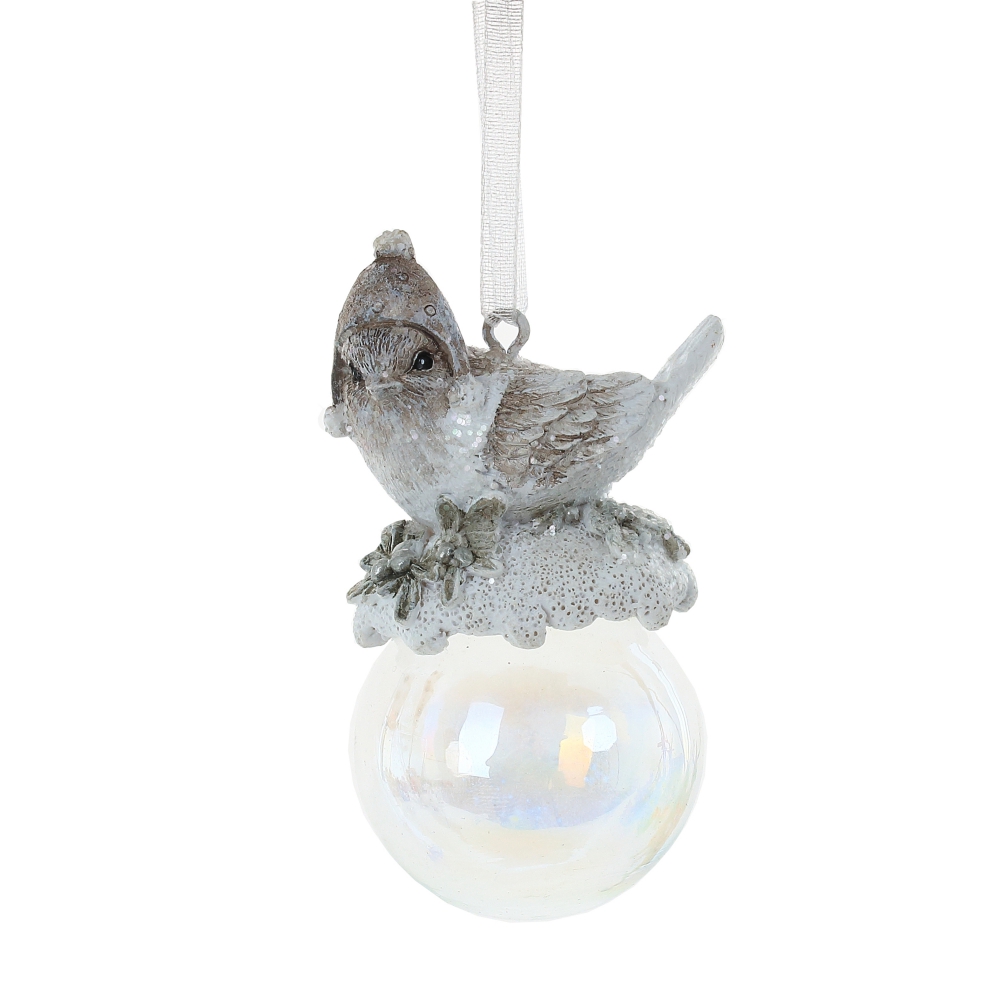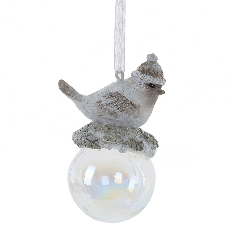Новогоднее украшение Птичка на перламутровом шаре добавит нотку лесного очарования вашему хвойному деревцу и чудесно дополнит праздничное убранство. Представлено в трех вариантах.