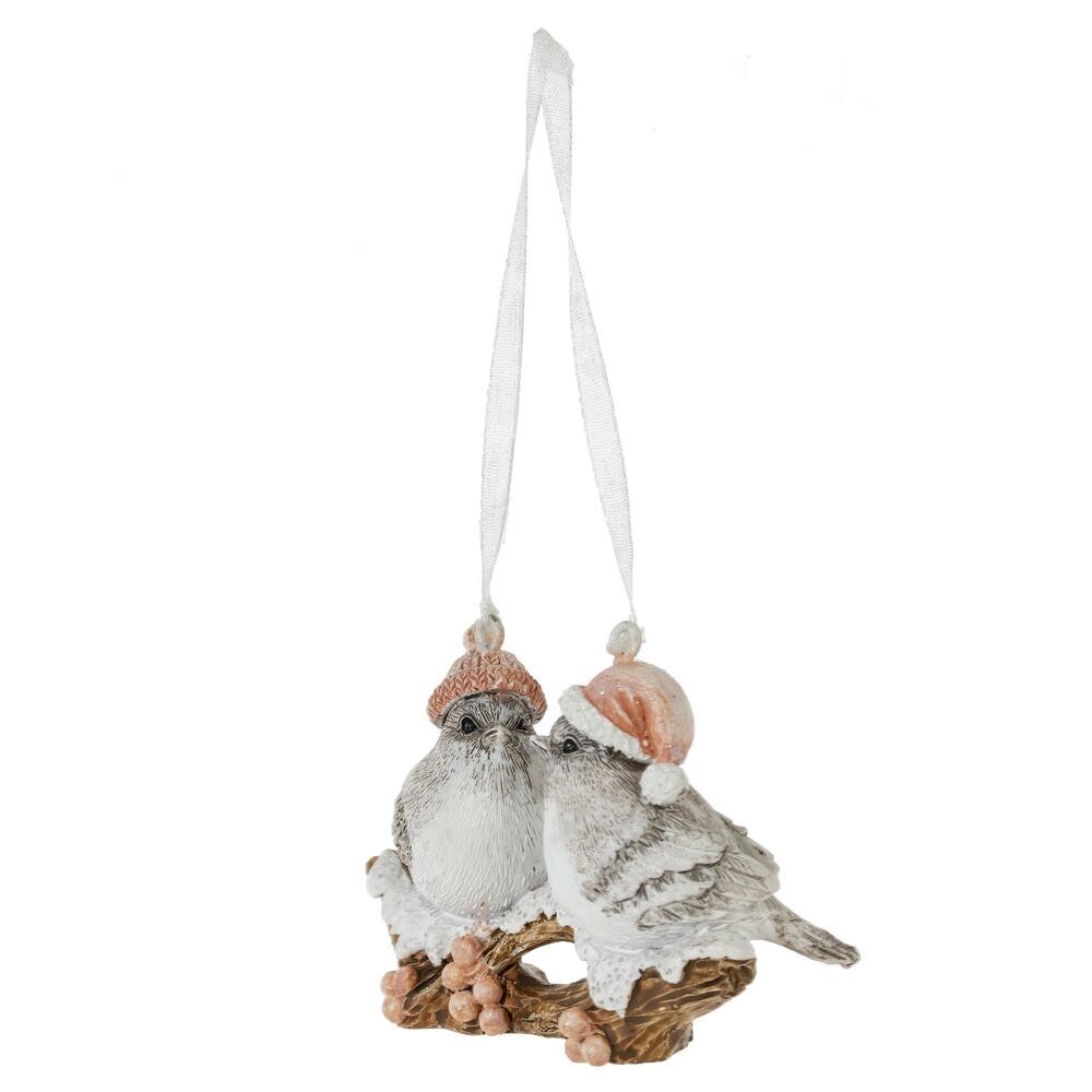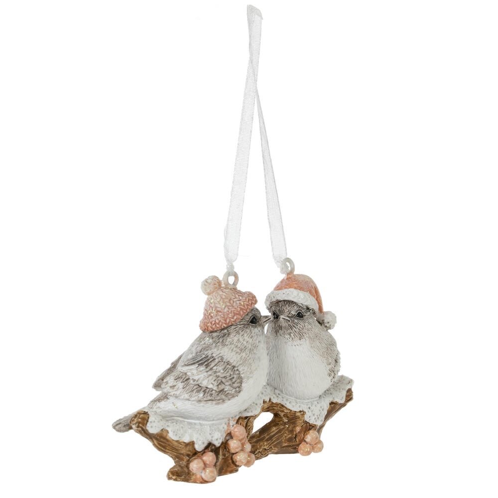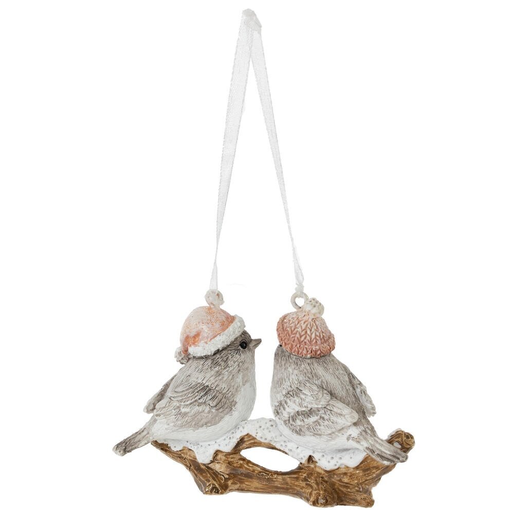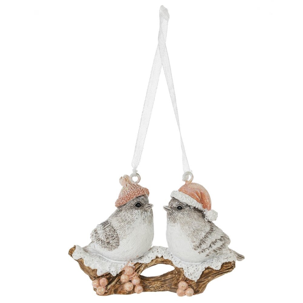 Декоративное подвесное украшение «Птички» выполнено из прочного полистоуна с высокой детализацией. Две маленькие милые птички в зимних шапочках уютно сидят на веточке с ягодами, символизируя нежность и любовь. Это изящное украшение наполнит интерьер праздничным теплом и станет прекрасным подарком на Новый год, создавая уютную и радостную атмосферу в доме.