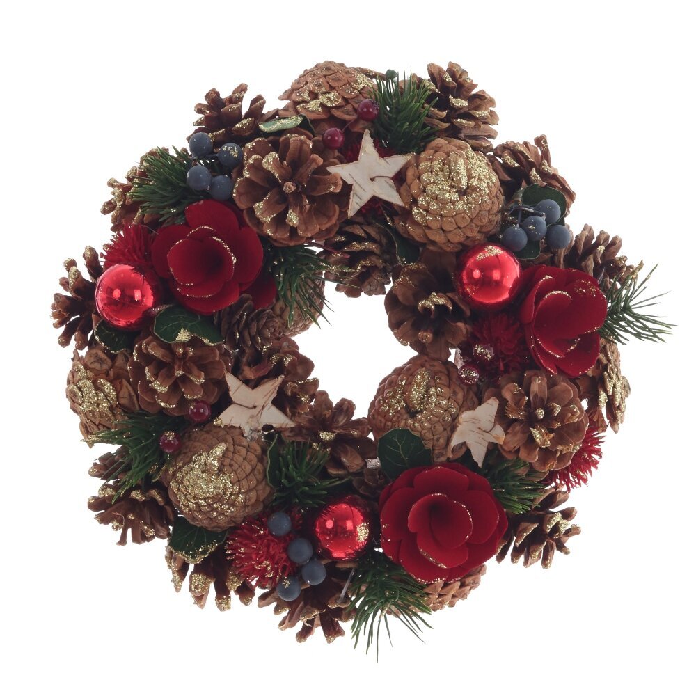 Декоративный рождественский венок диаметром 24 см украшен натуральными шишками, красными цветами и шариками, крошечными ягодами синего цвета, зеленым листьями и звездочками. Этот венок идеально подойдет для праздничного оформления помещения. Этот венок будет отлично смотреться на двери, стене или столе, придавая природного уюта и праздничного настроения.