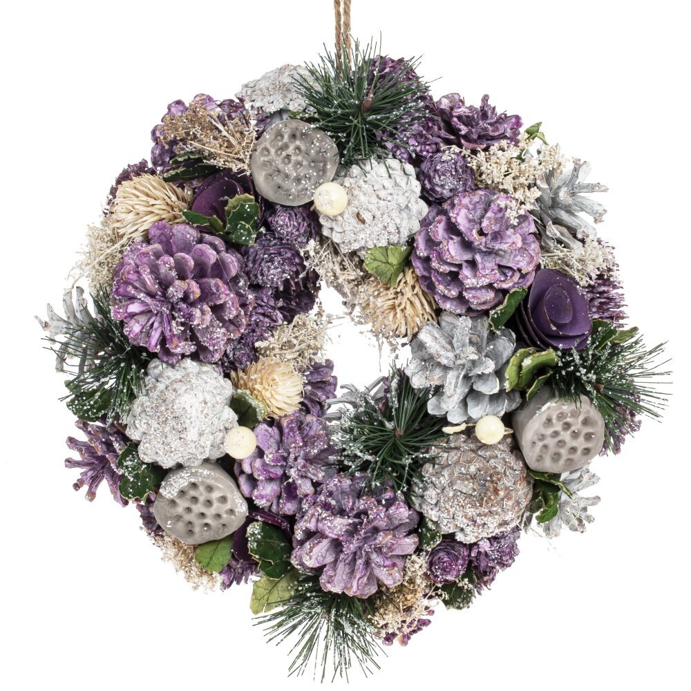 Новогодний декоративный венок с ярким декором из натуральных шишек, искусственных цветов и ягод будет уместен в любом интерьере, создавая уют и праздничное настроение.