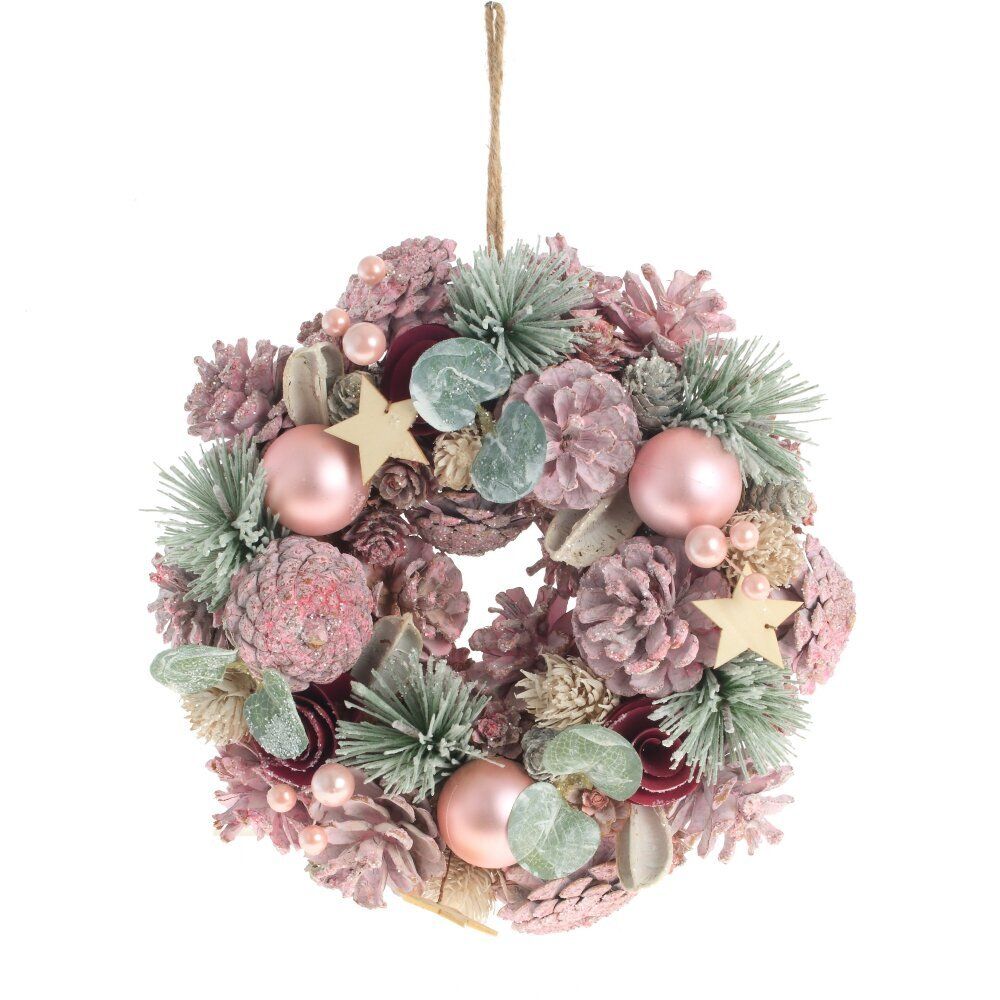 Интерьерный венок буквально усыпан разнообразными натуральными шишками, а так же искусственными ягодами, листьями и хвойными ветками. Украшен шарами и звездами. Такой рождественский венок поможет создать праздничное настроение и уютную атмосферу в вашем доме.