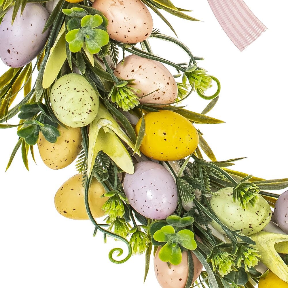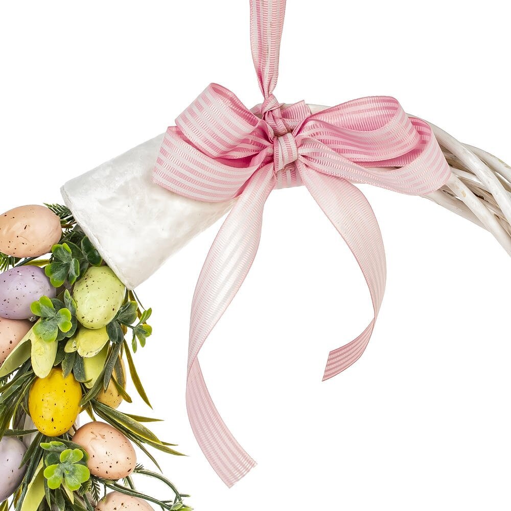 Декоративное изделие «Венок пасхальный» – изысканное украшение для дома к светлому празднику Пасхи. Основа выполнена из натуральных материалов и оформлена в виде аккуратно переплетённых веточек, окрашенных в светлый оттенок. Одна сторона венка декорирована полимерными пасхальными яичками нежных пастельных цветов и реалистичной зеленью, создающими эффект живой весенней композиции. Венок дополнен атласной петелькой и розовым бантом, благодаря чему его удобно подвесить на дверь, стену или окно. Такое украшение привнесёт в интерьер атмосферу уюта, обновления и праздничного настроения, а также станет прекрасным подарком родным и друзьям на Пасху.