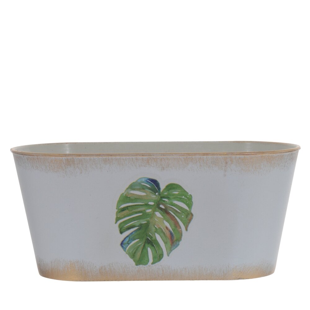 Представлено стильное кашпо, выполненное из полимерных материалов. Его поверхность украшена изящным рисунком с изображением листьев монстеры в ярко-зеленых тонах. Бело-золотистые акценты по краям придают изделию элегантность и современный вид. Такое кашпо идеально подойдет для оформления интерьера дома, офиса или террасы, прекрасно сочетается с различными стилями декора. Преимуществами полимерных материалов являются их легкость, прочность и устойчивость к влаге, что делает это кашпо не только красивым, но и практичным решением для выращивания комнатных растений.