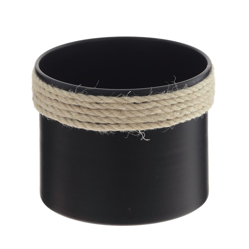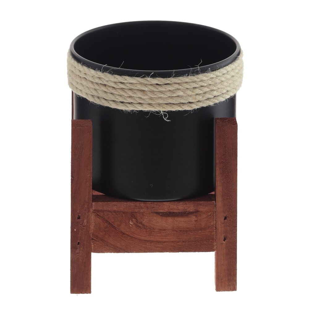Стильное кашпо, выполненное из комбинации нескольких материалов — металла, дерева и текстильных элементов. Основная часть кашпо изготовлена из прочного чёрного металла, что делает изделие долговечным и устойчивым к внешним воздействиям. Верхний край украшен декором из толстой верёвки бежевого цвета, что придаёт изделию особую изюминку и добавляет ощущение уюта. Подставка для кашпо выполнена из натурального дерева, благодаря чему конструкция смотрится надёжно и устойчиво, а также гармонично впишется в интерьер, оформленный в скандинавском или эко-стиле. Такое кашпо станет отличным элементом декора и прекрасно подойдёт для размещения комнатных растений, при этом сочетание материалов делает его универсальным решением как для дома, так и для офиса.