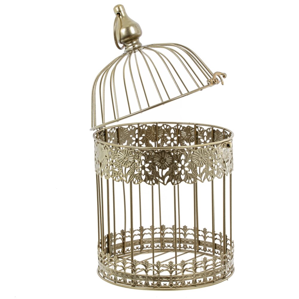 Декоративная клетка изготовлена из прочного металла, который обеспечивает ей долгую службу и сохраняет первоначальный вид на протяжении длительного времени. Ее золотистый цвет делая ее превосходным дополнением к любому интерьеру. Благодаря кольцу для подвешивания, она может быть удобно размещена в любом месте вашего дома, добавив стиля и изысканности.