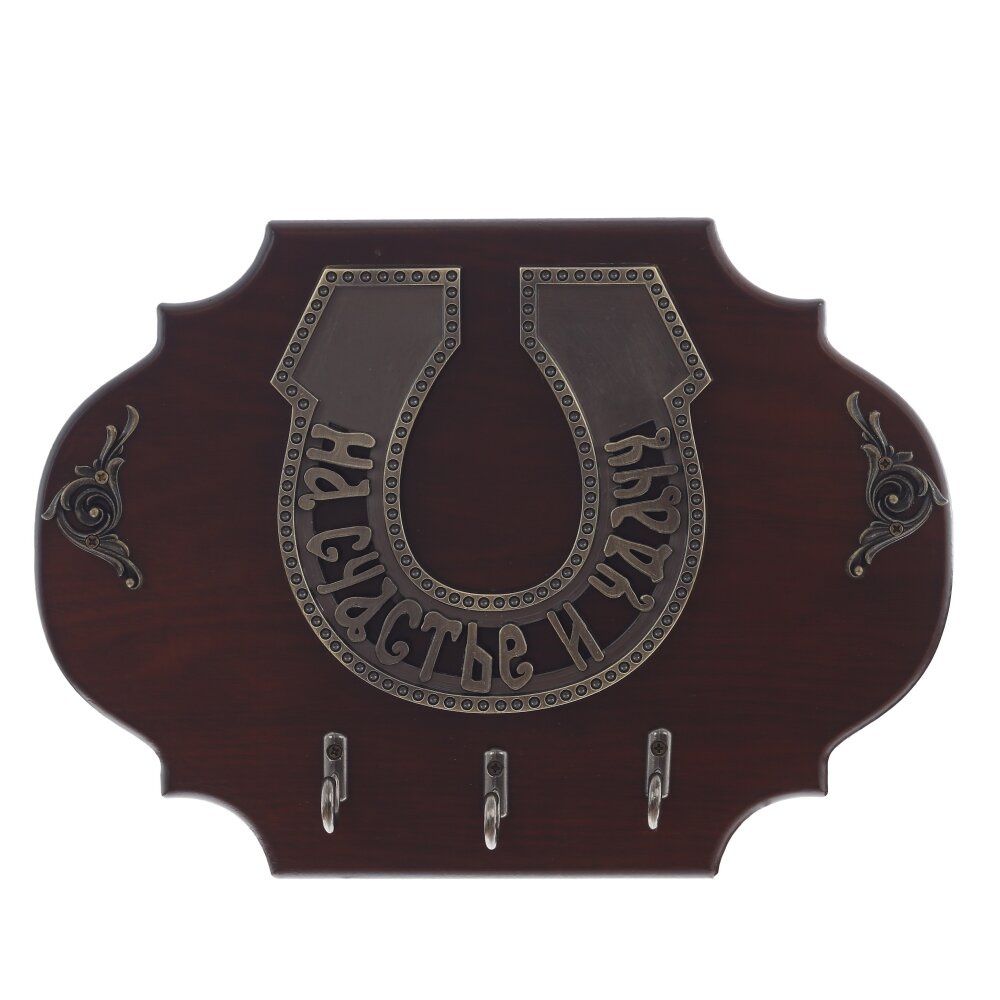 Ключница настенная, открытого типа, с тремя металлическими крючками и декором в виде подковы с надписью "На счастье и удачу" и ажурных угловых элементов. Ключница – предмет не только красивый, но и функциональный, поэтому ей найдется место и в офисе, и в квартире, и в загородном доме.